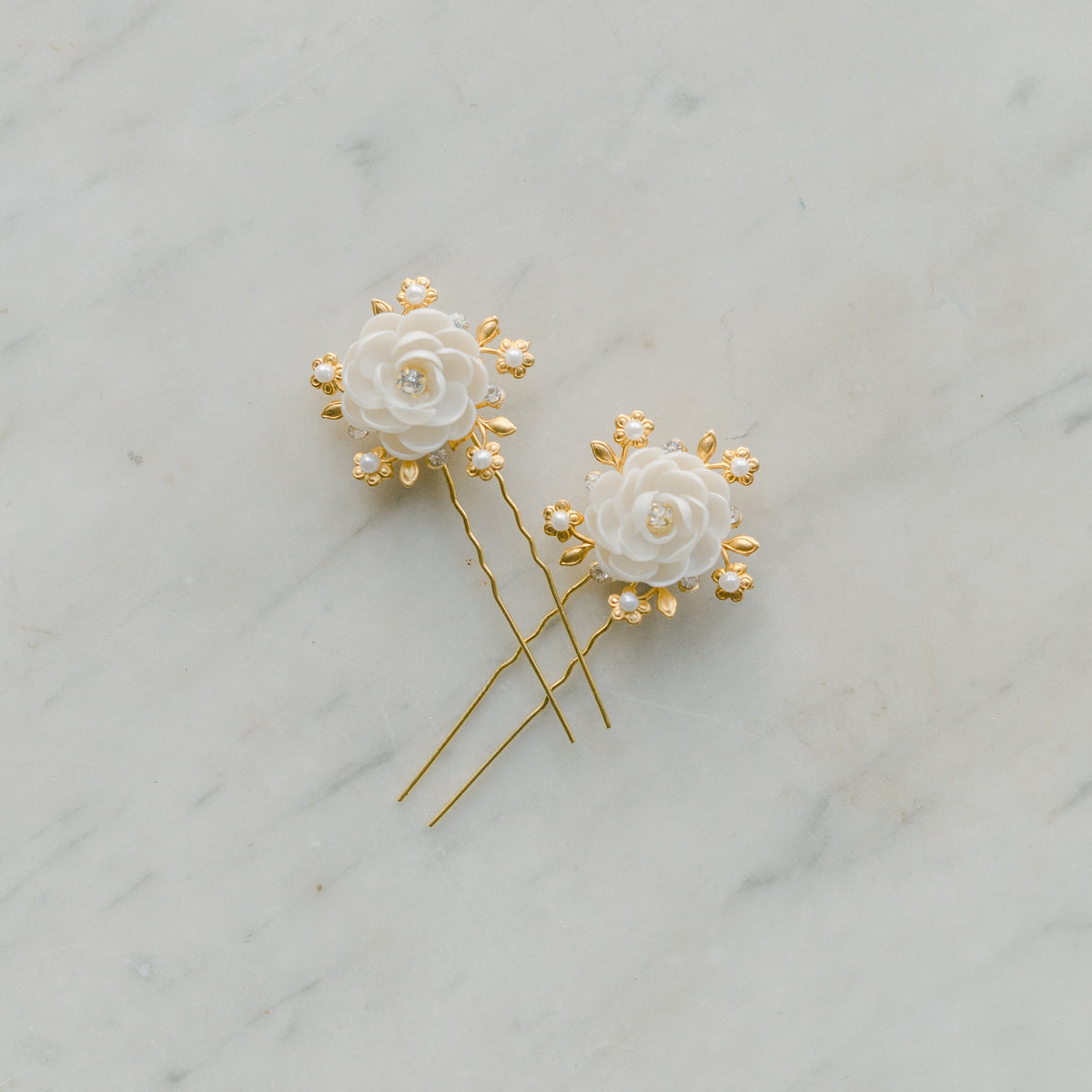 flowers are hand formed with pearl effect clay and wired with gold plated brass daintily attached to metal hair pins.