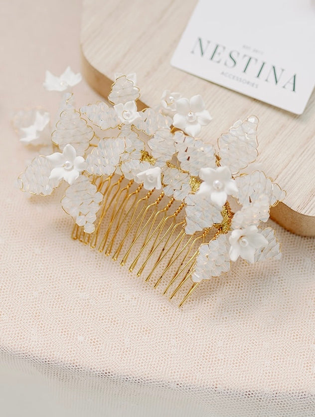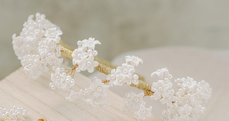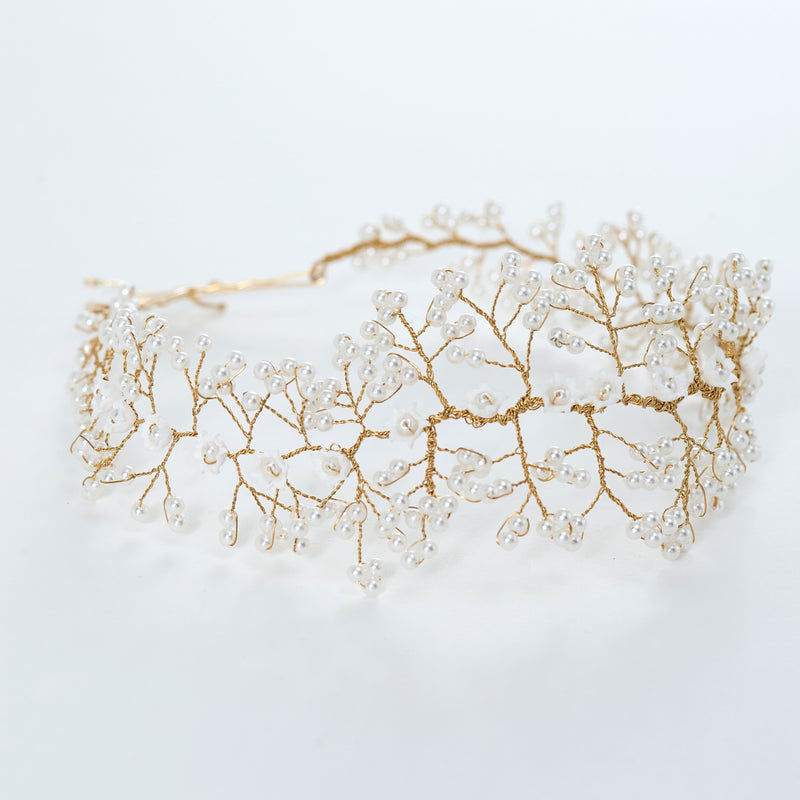 pearls and clay flowers bridal crown, baby beath wedding headband style 22001