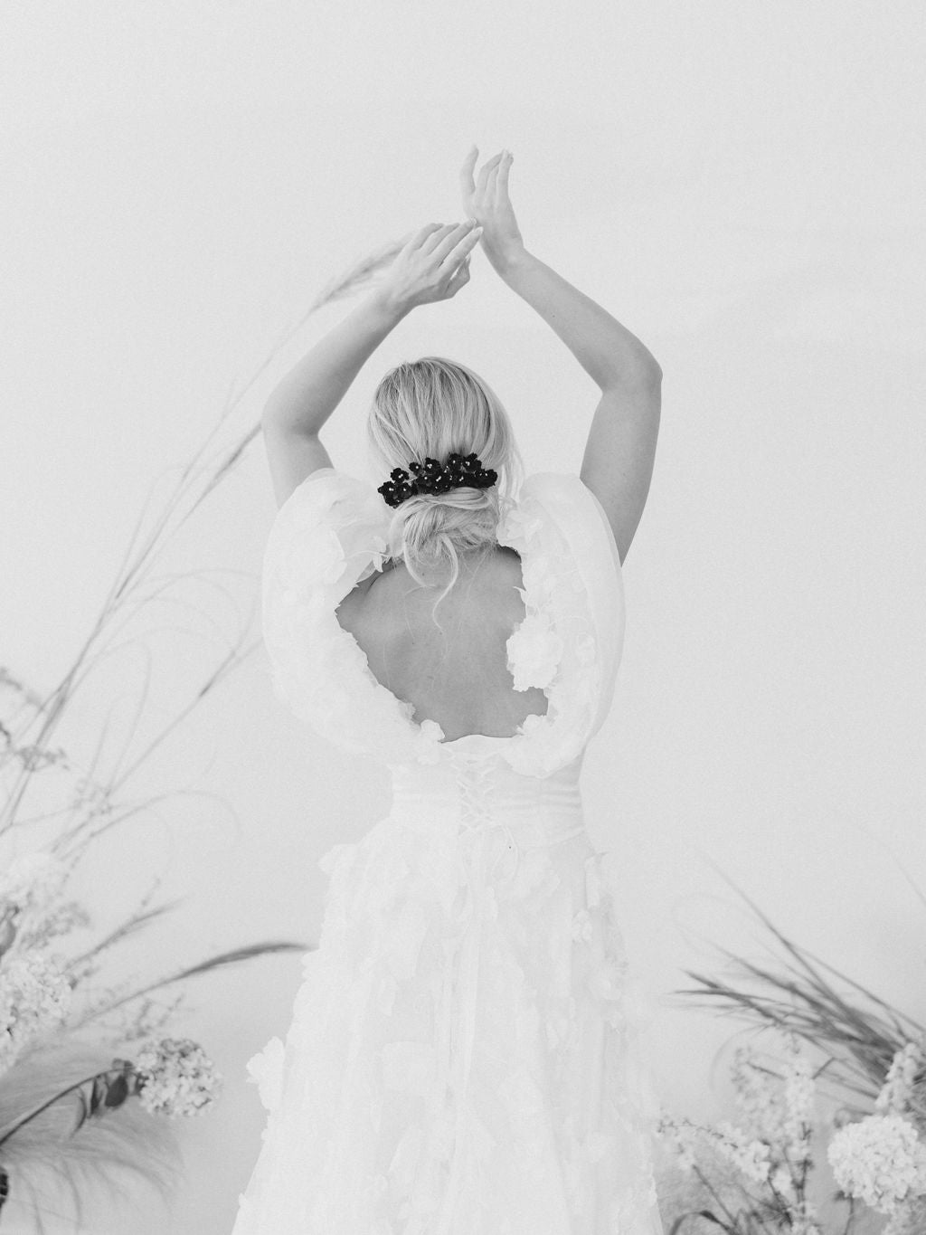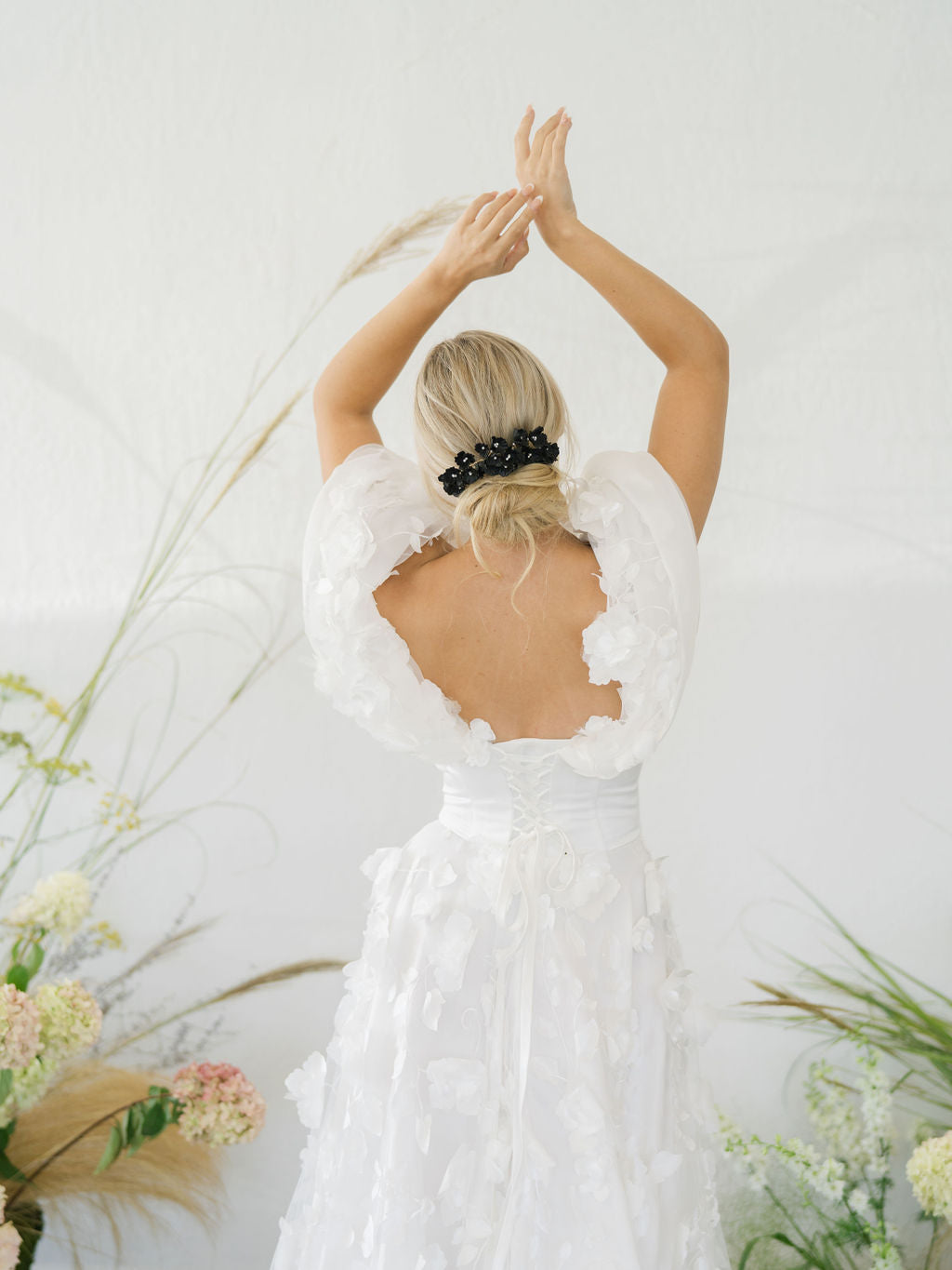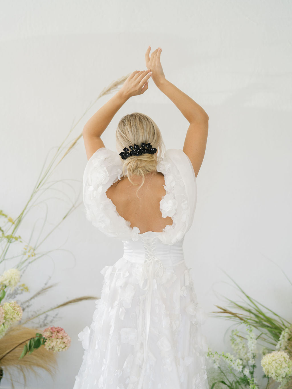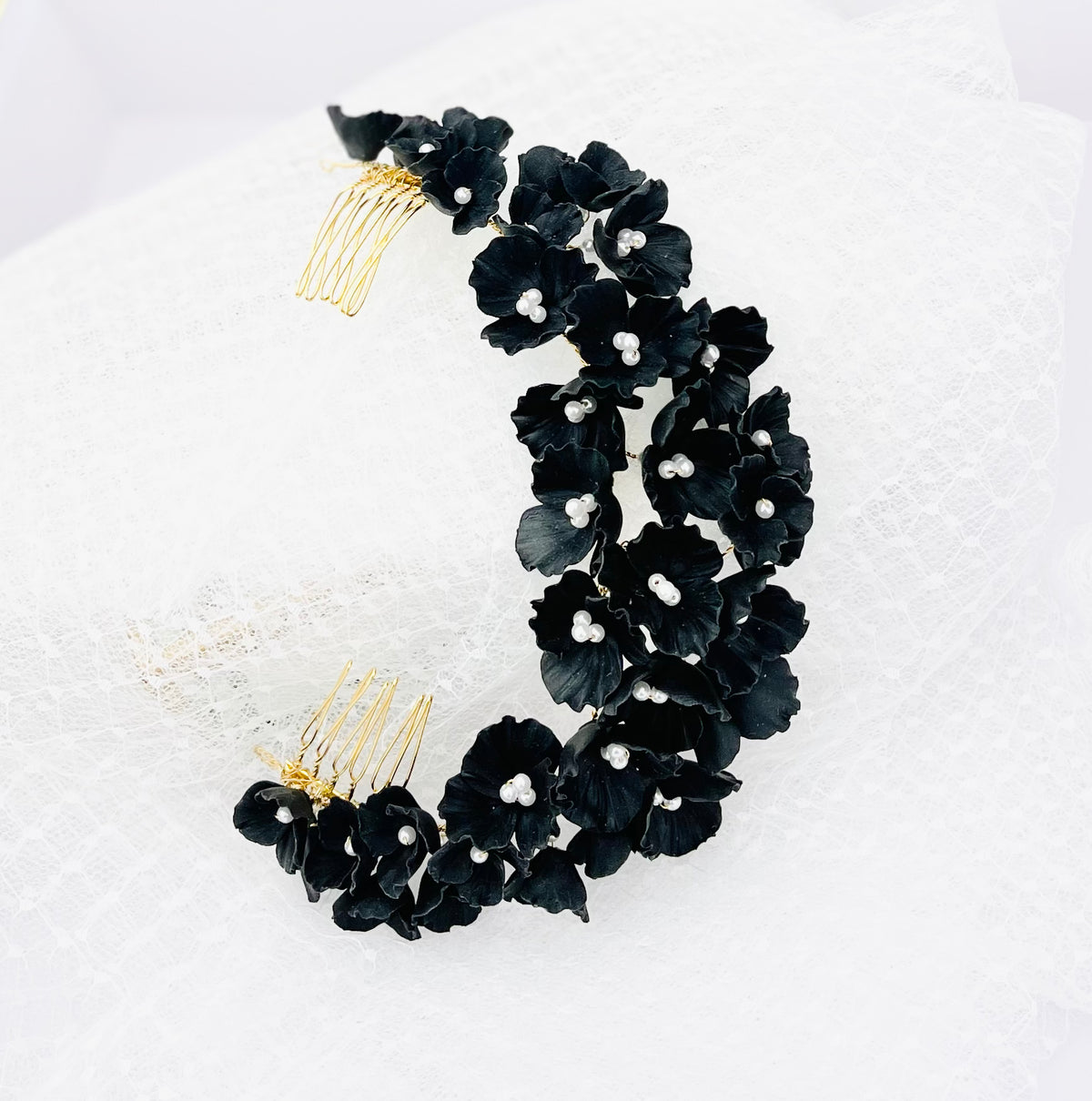 Black or white floral headpiece. do you want something different but still timeless and classic, this elegant floral headpiece features black clays flowers adorned with acrylic Pearls, and 2 hair combs and pins loops for a great flexibility in styling.