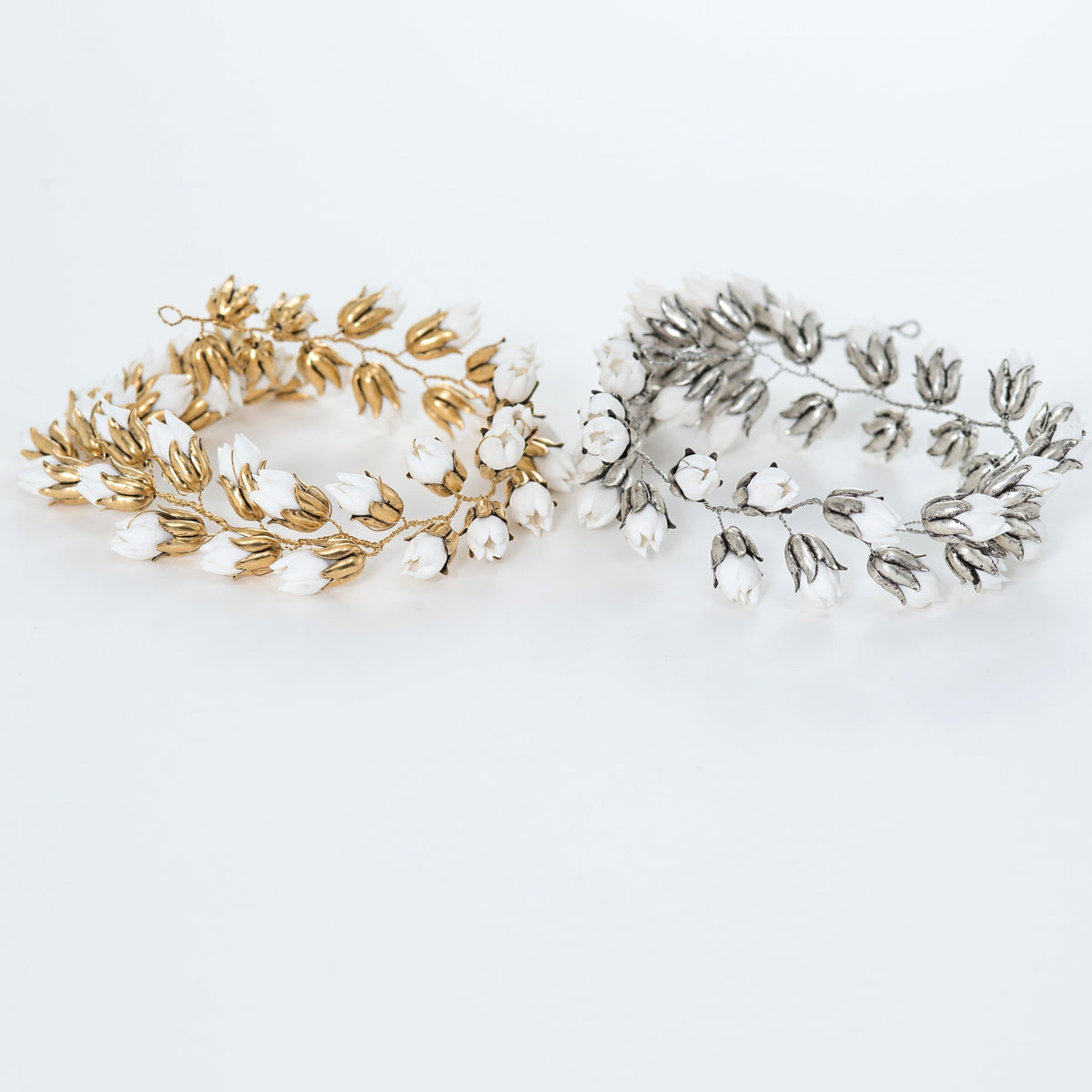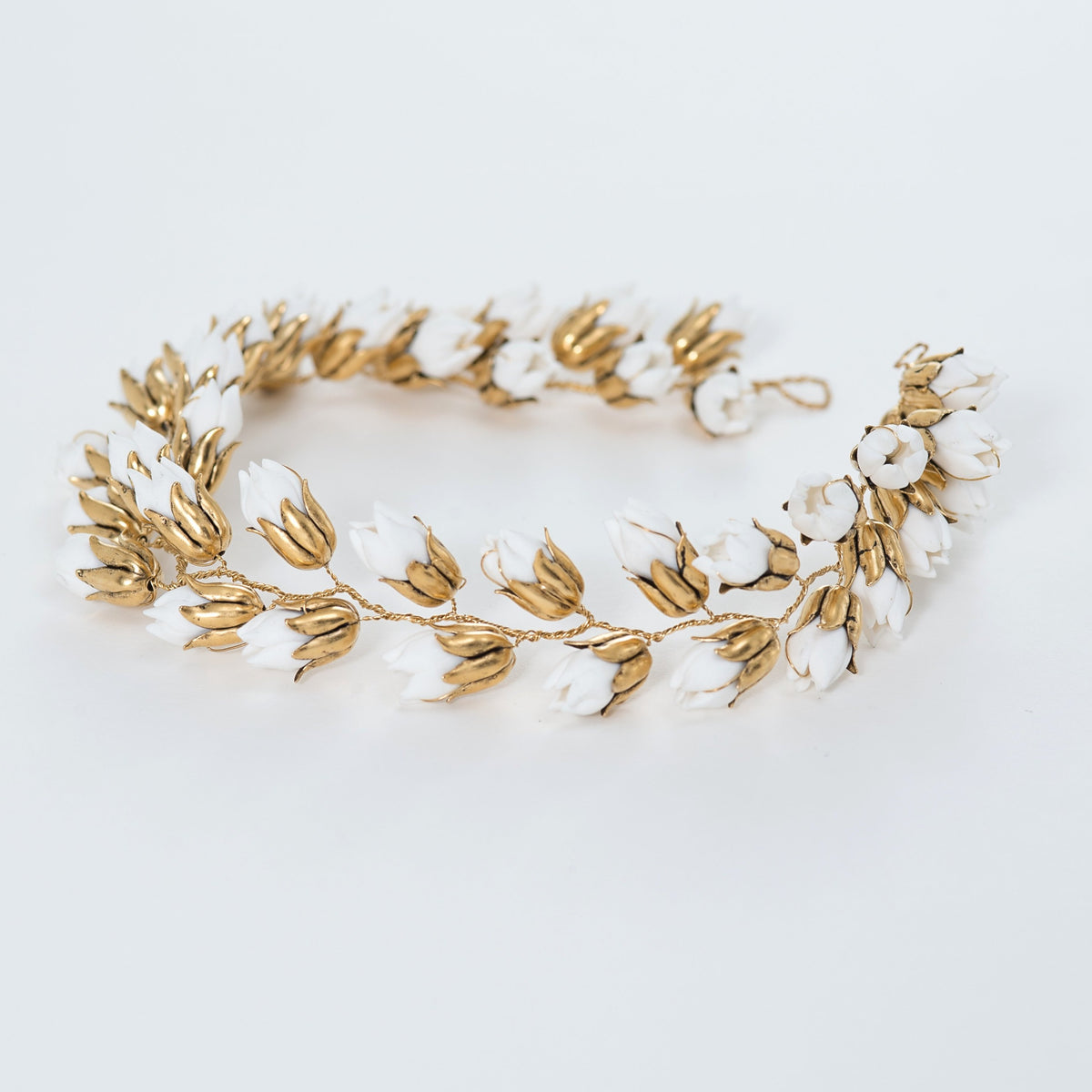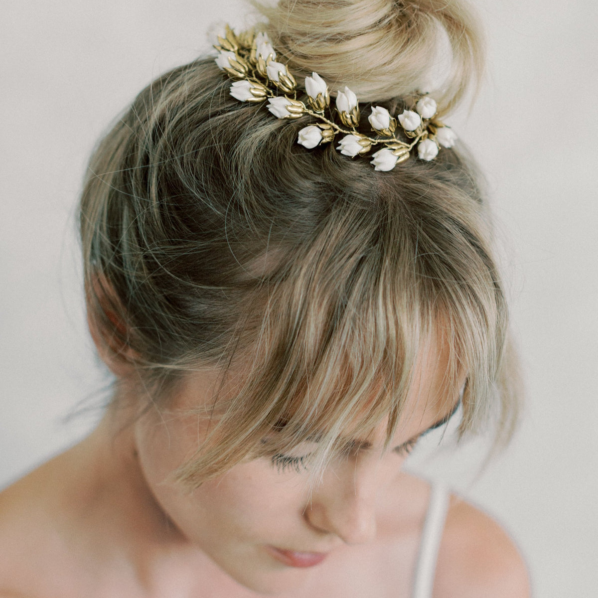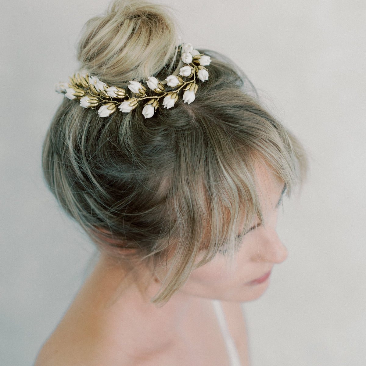 Wending hair vine, wedding headpiece, one of the kind headpiece handcrafted with white hand formed clay flowers buds and gold plated brass flowers buds. Lightweight and flexible, flowers are hand wired.