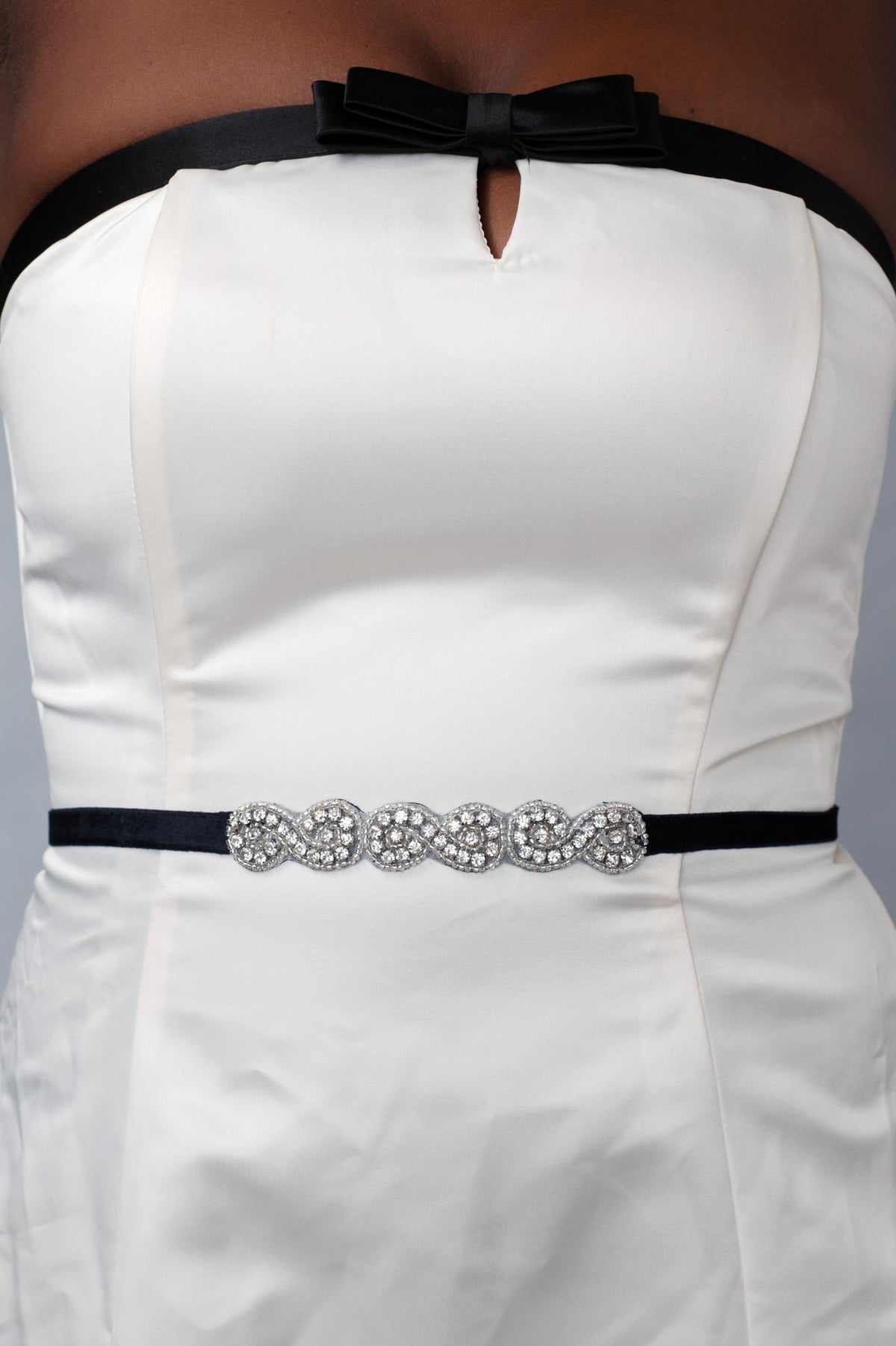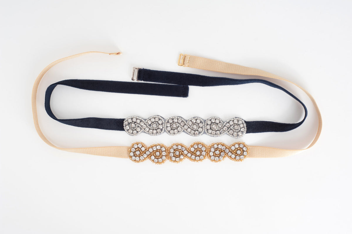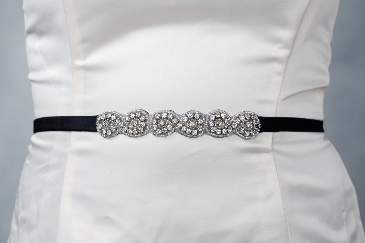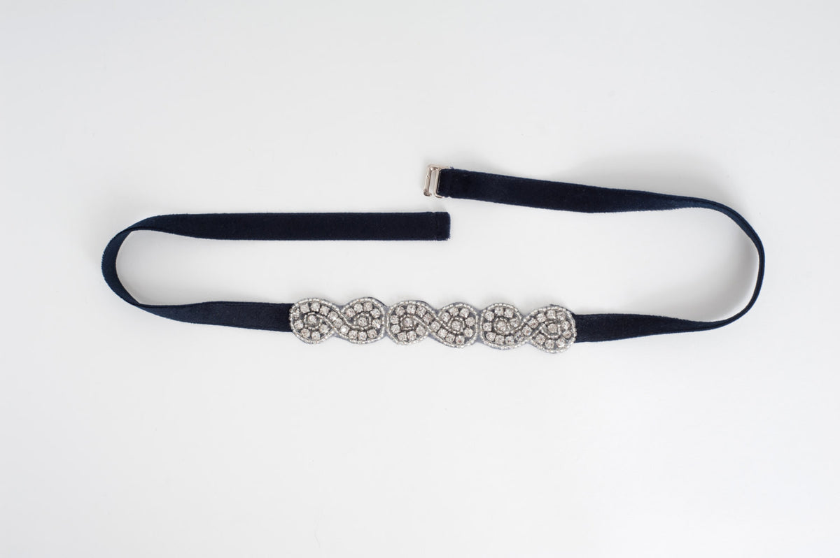 rich rhinestones beading on a soft velvet stretch ribbon or stretch satin (silver ivory or gold)