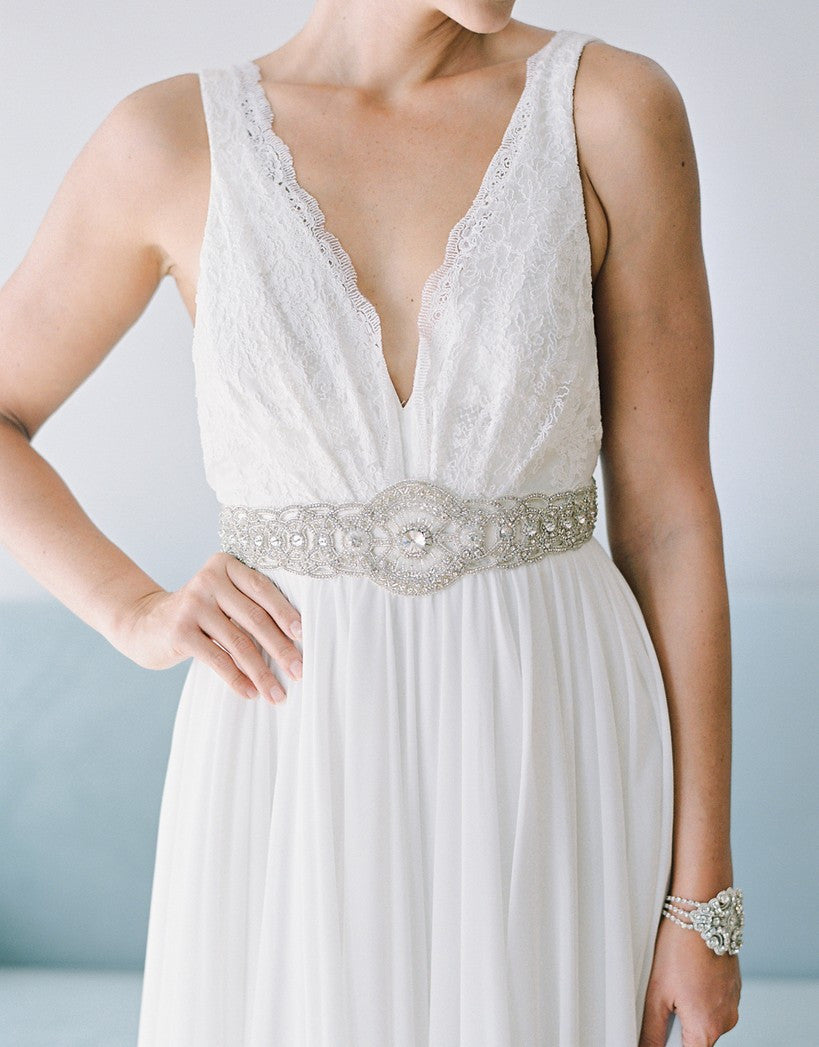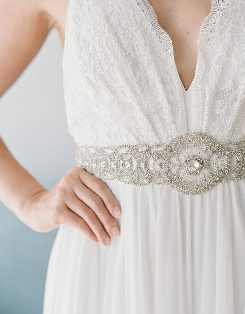 14" of beading attached to a 1 1/2" wide ivory or Silver satin ribbon