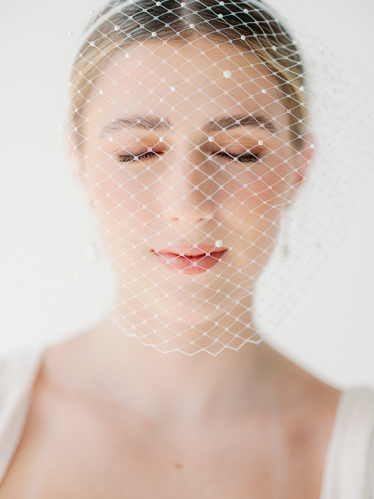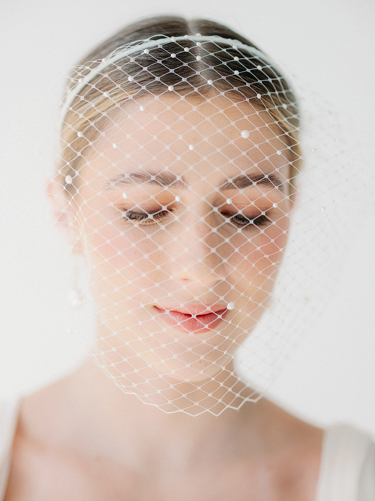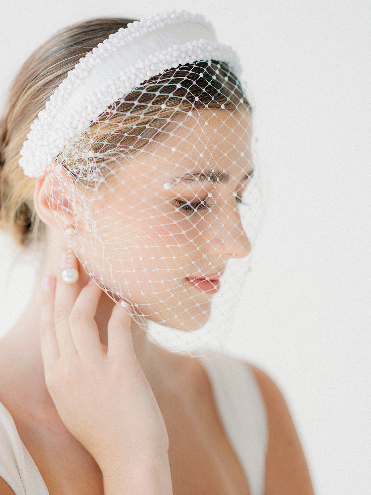 The birdgcage veil headband is made of nylon veiling with scatered pearls cabochons  in various sizes