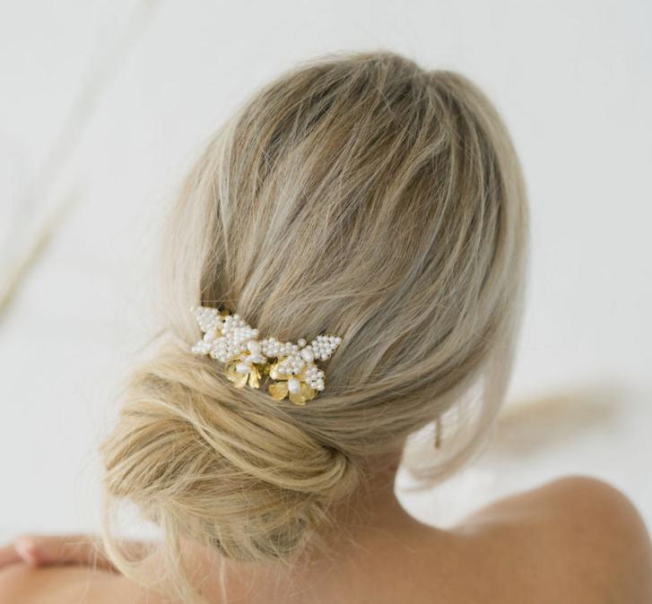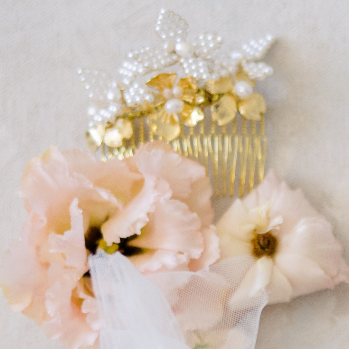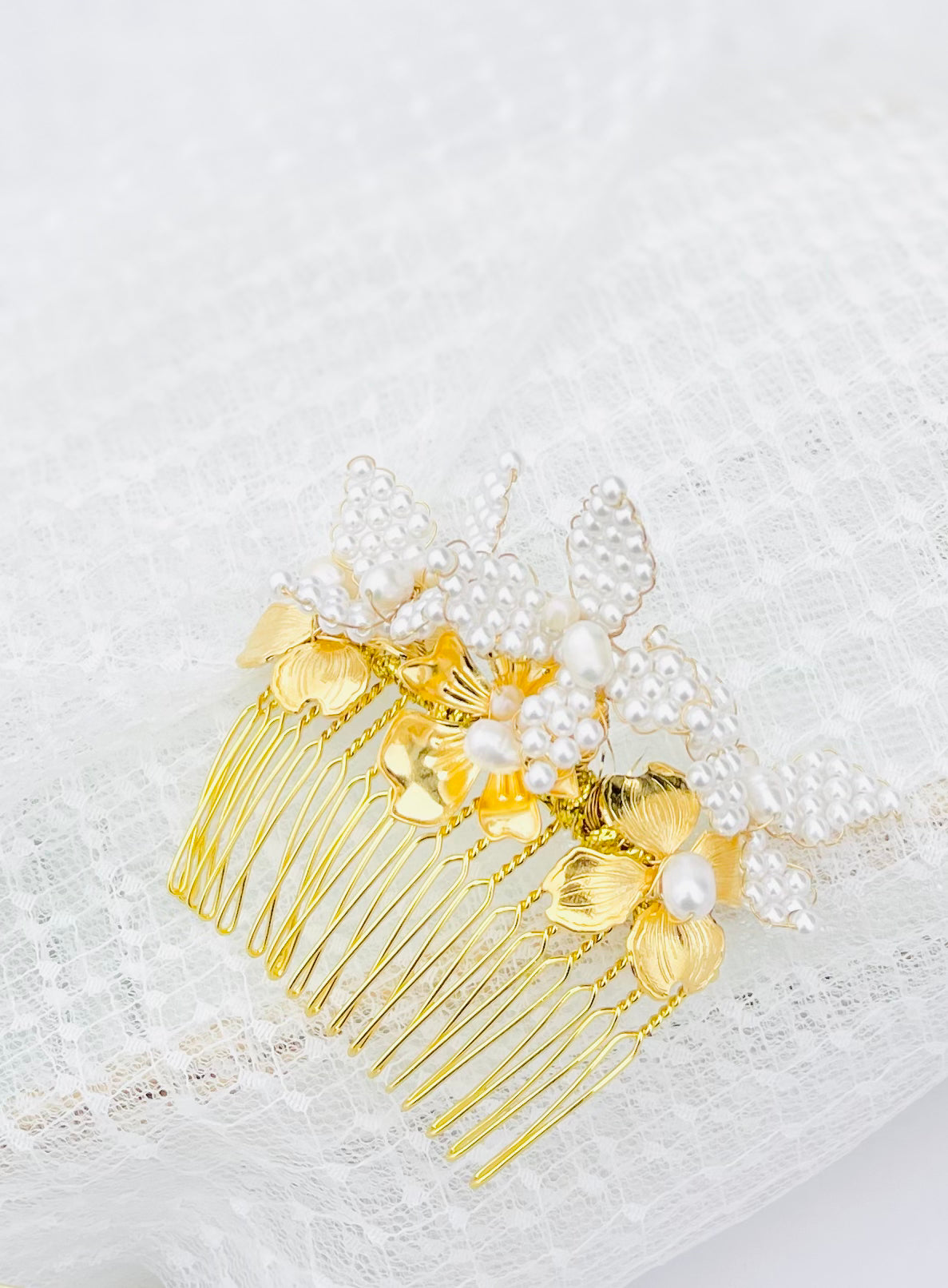 beautiful hair adornment, delicatly made with a metal wire hair comb , plated brass flowers and handbeaded pearls butterflies