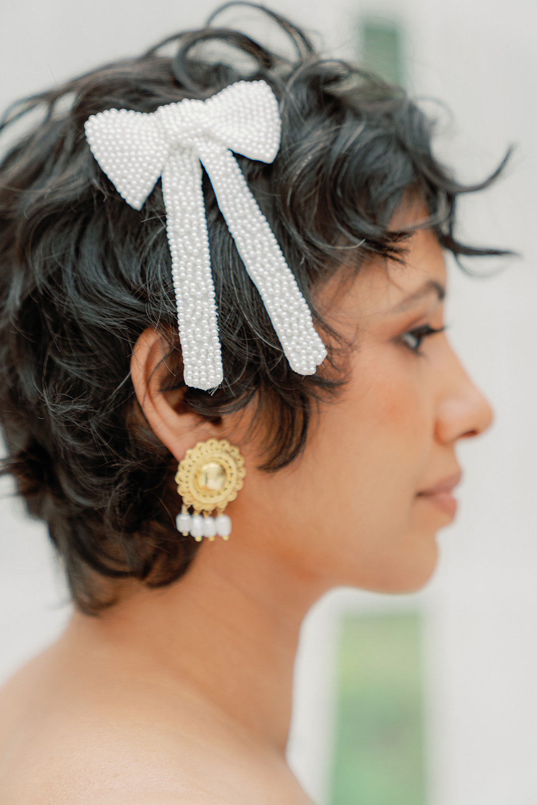 trendy bow hair clip made with faux pearls and an alligator clip. fun and fashionable additions to any bridal or everyday hairdo.