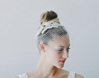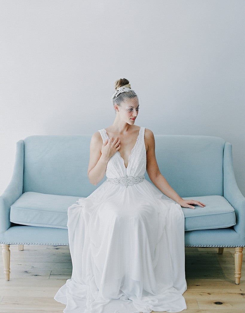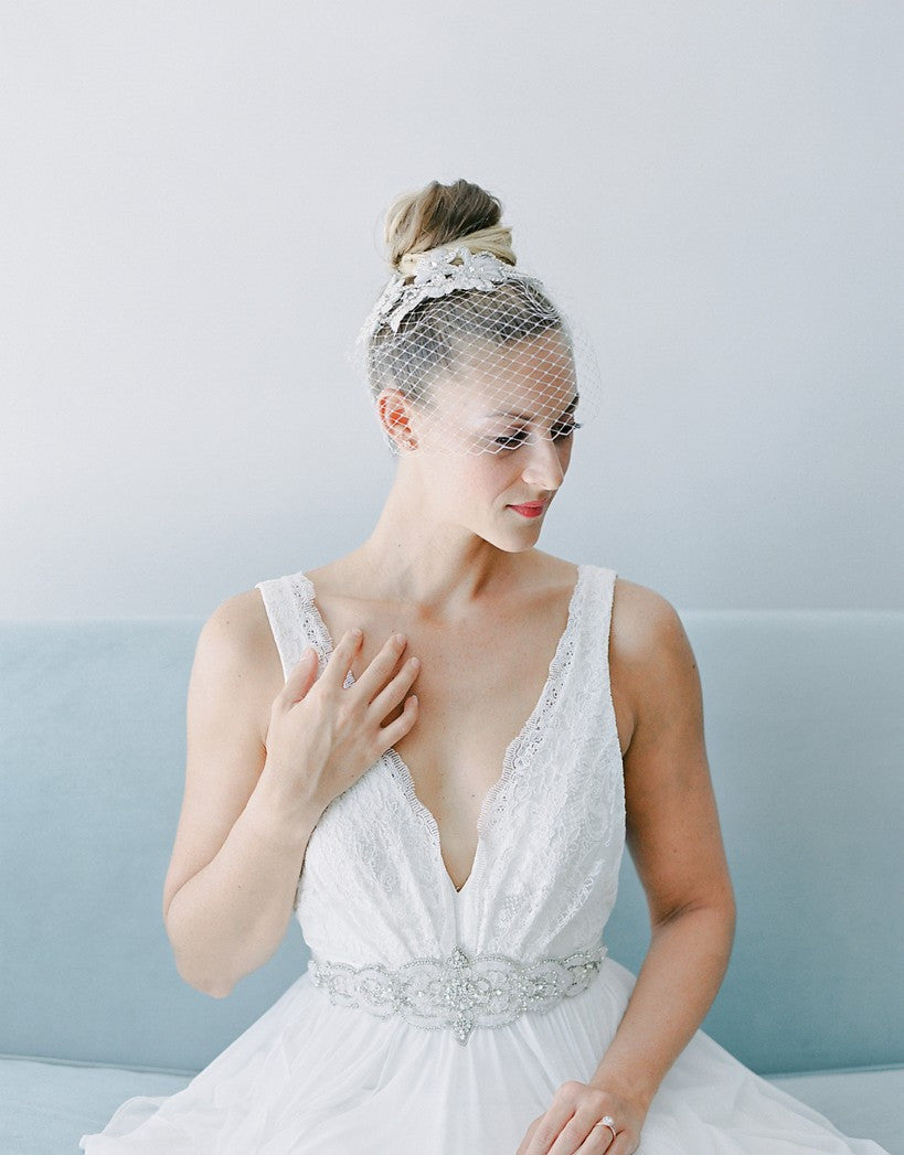 adorned birdcage veil with handbeaded applique made with glass beads and rhinestones