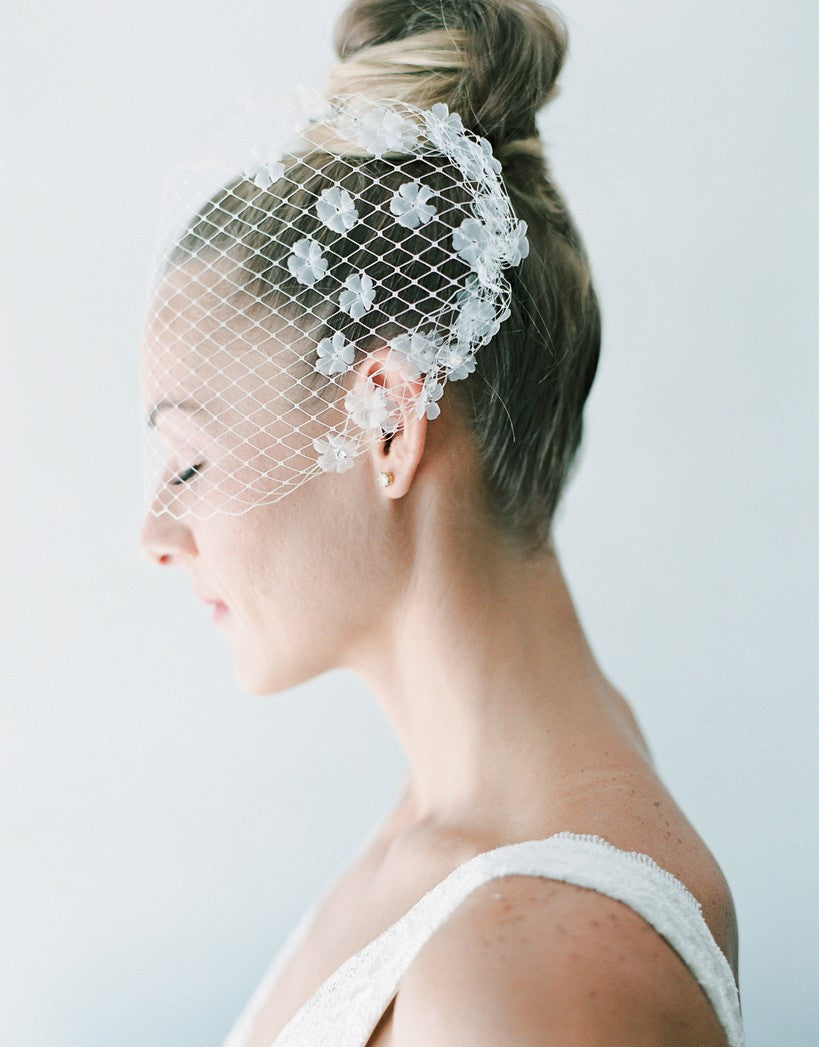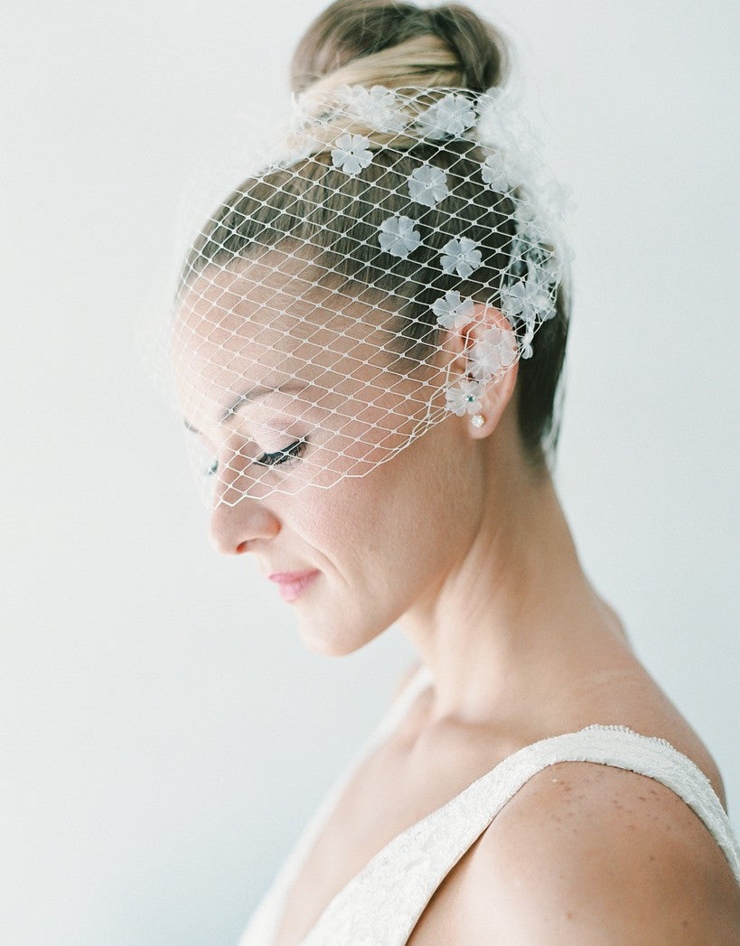 floral birdcage veil with organza pressed flowers and russian netting