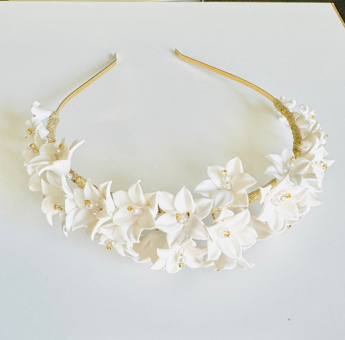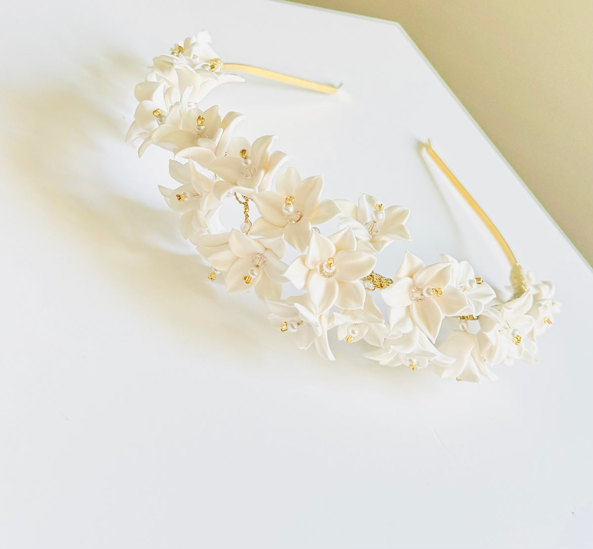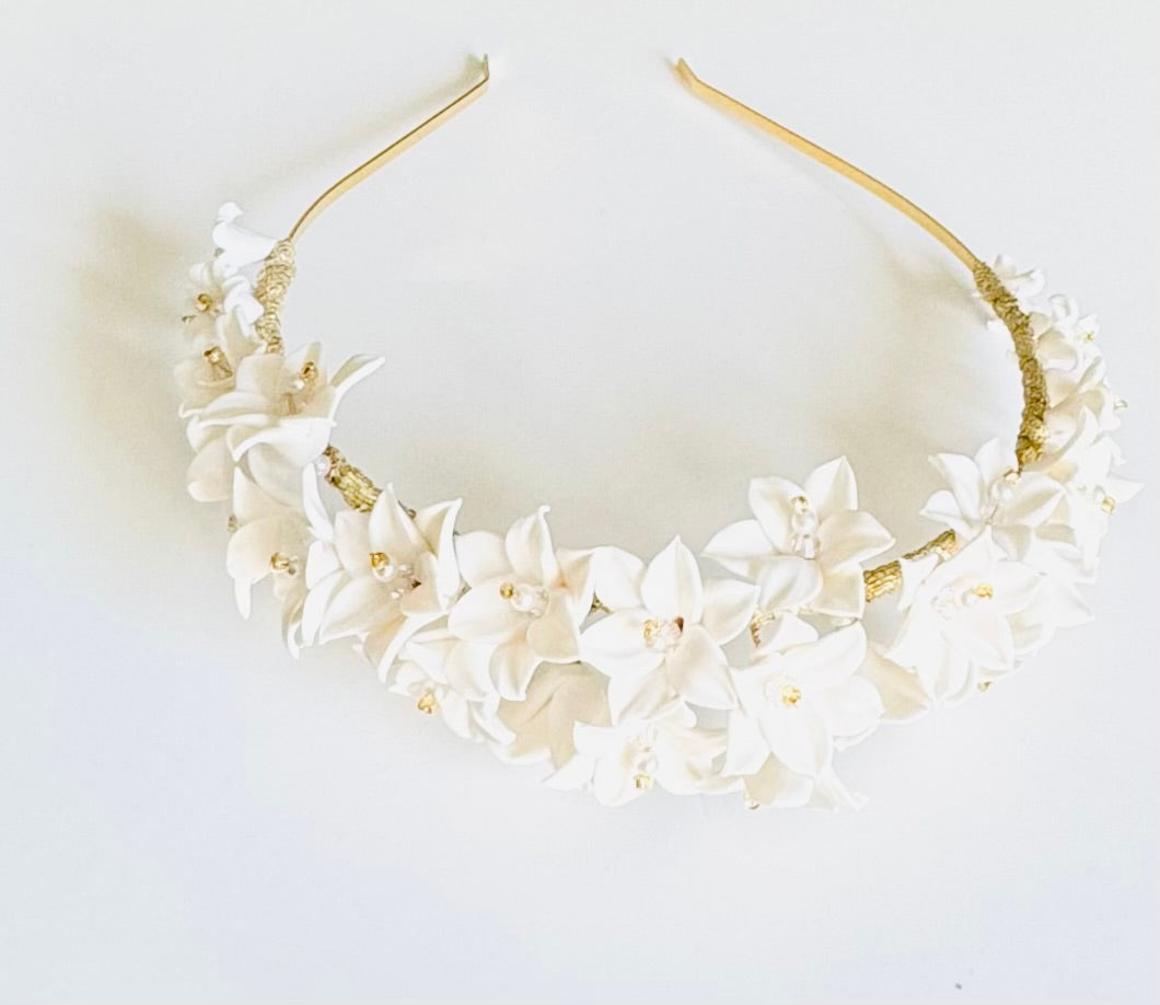 romantic, timeless, beautiful, this elegang floral headband features clays flowers adorned with austrian crystals beads and gold glass beads.