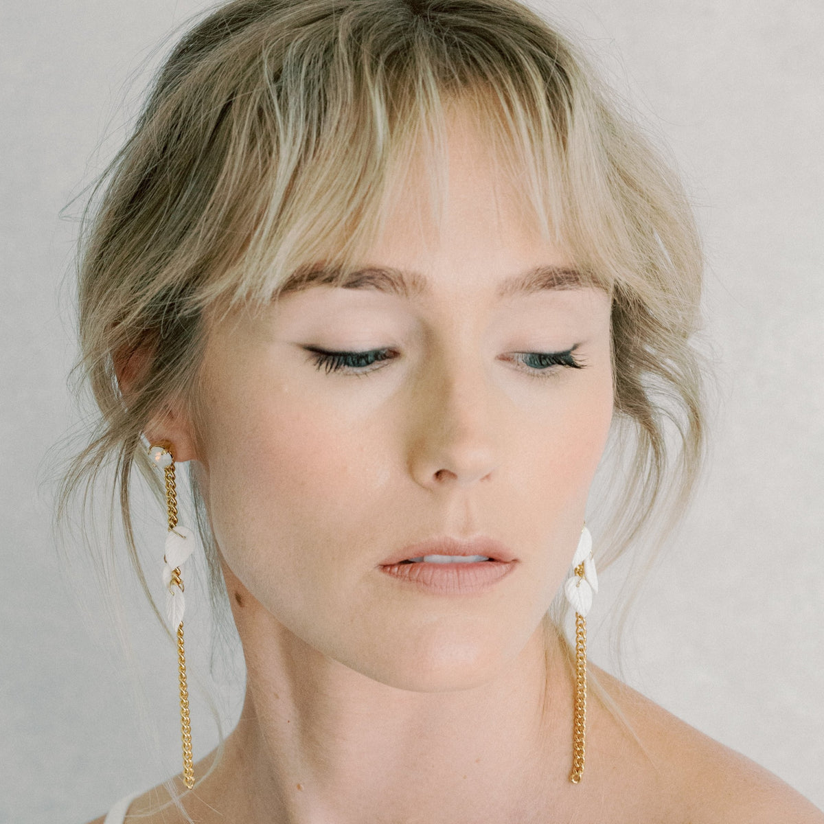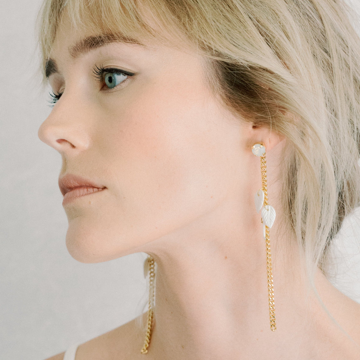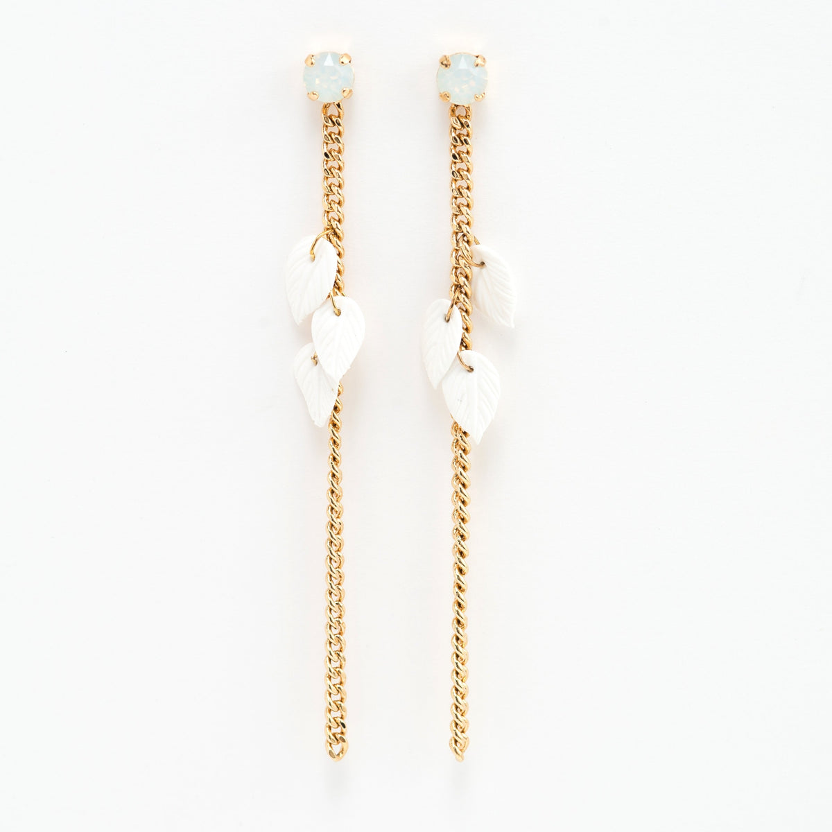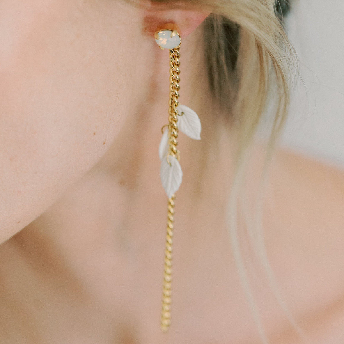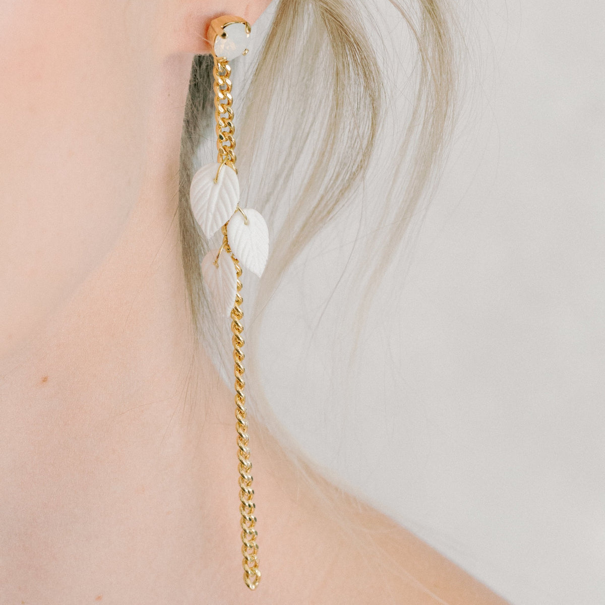 this earrings set is simple but yet dramatic with a long chain and the clay flowers add a little bic of romantic side to it along with the white opal swarovski crystal
