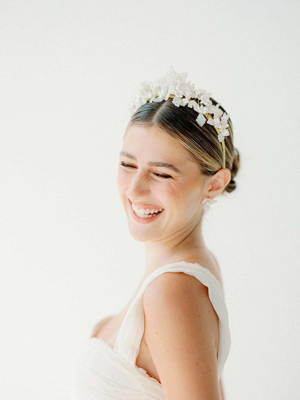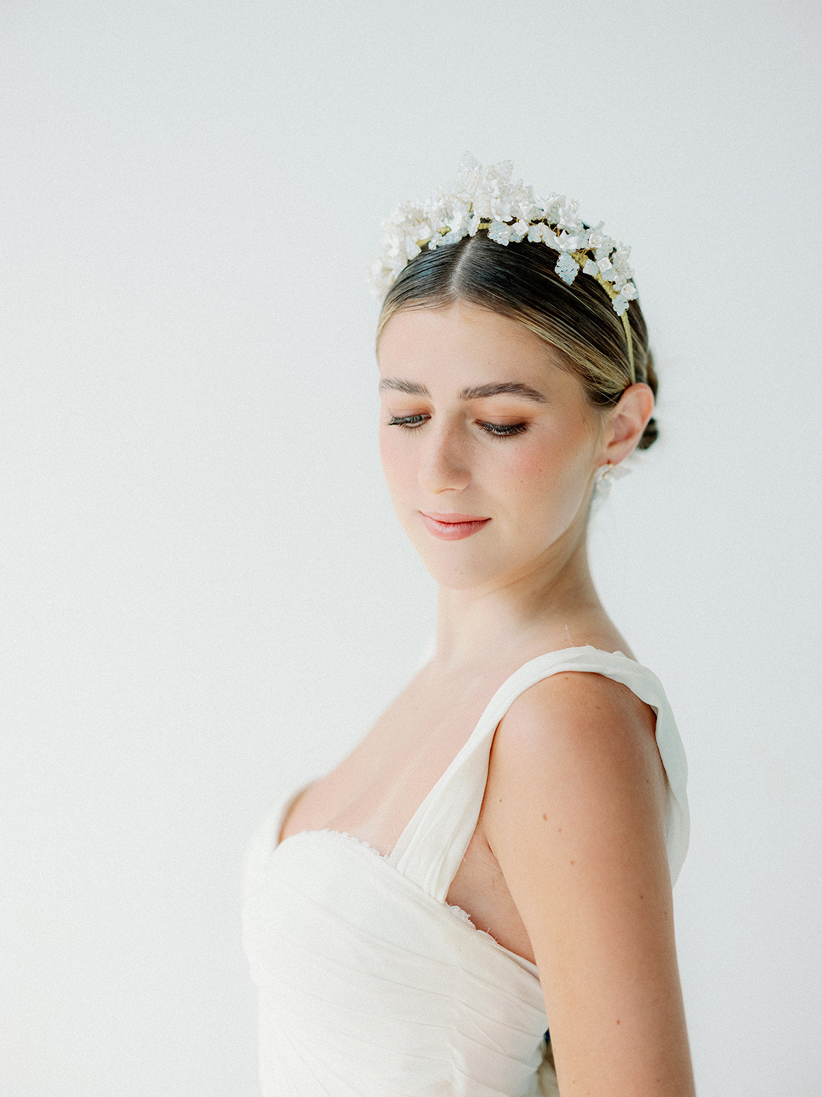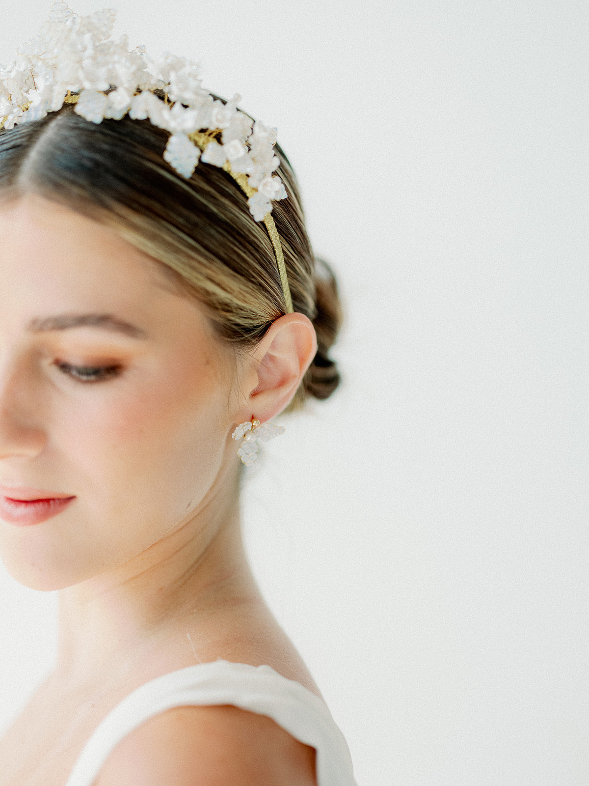 this headpiece is made with hundred of preciosa white opal crystal beads and clay flowers