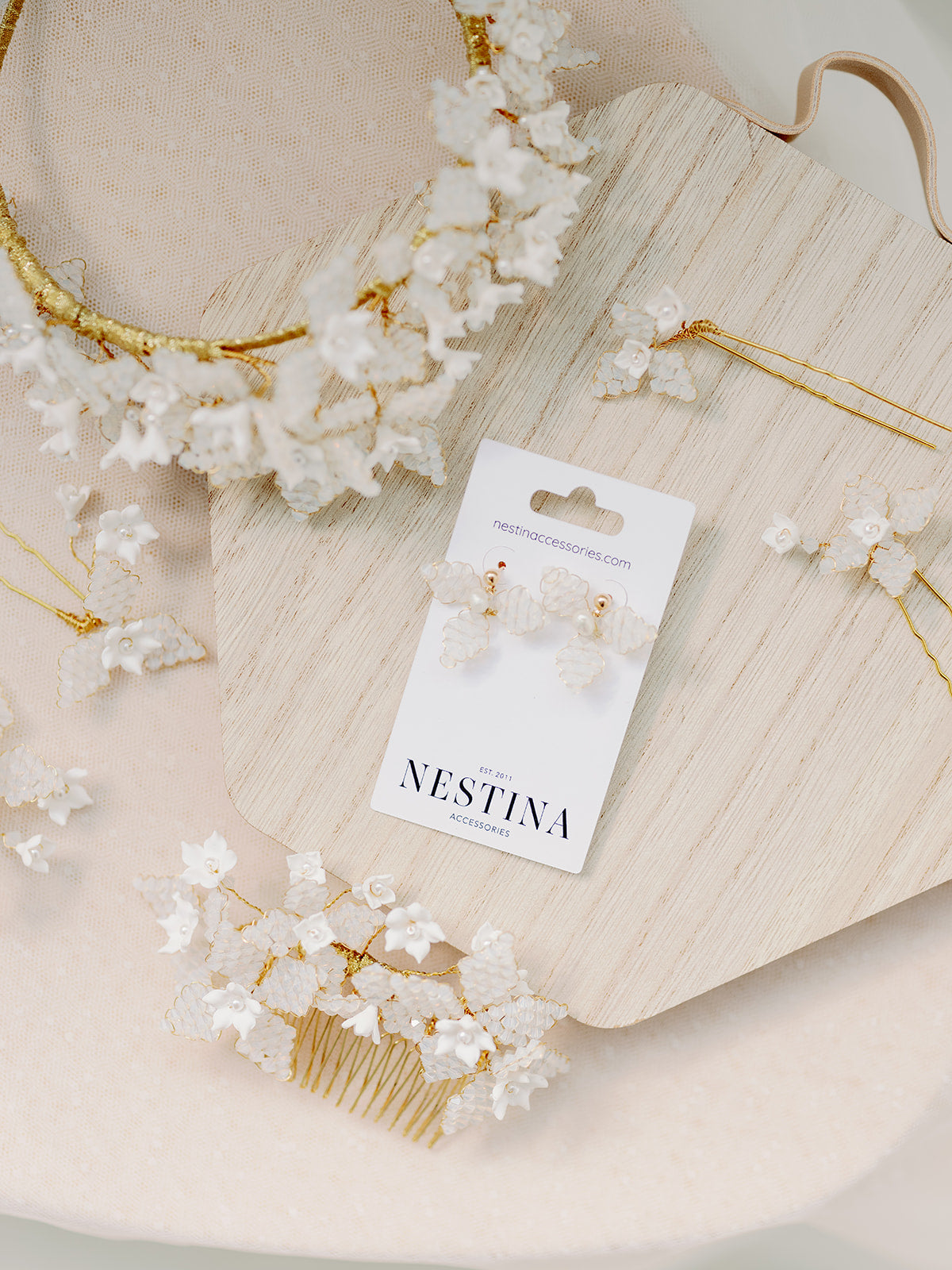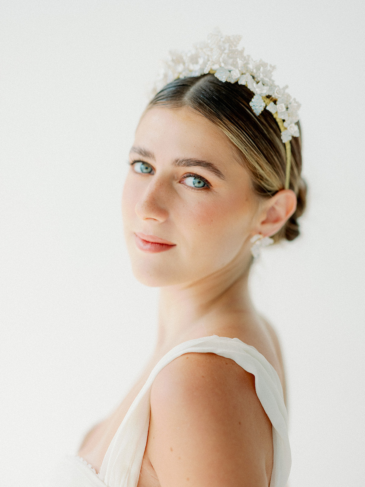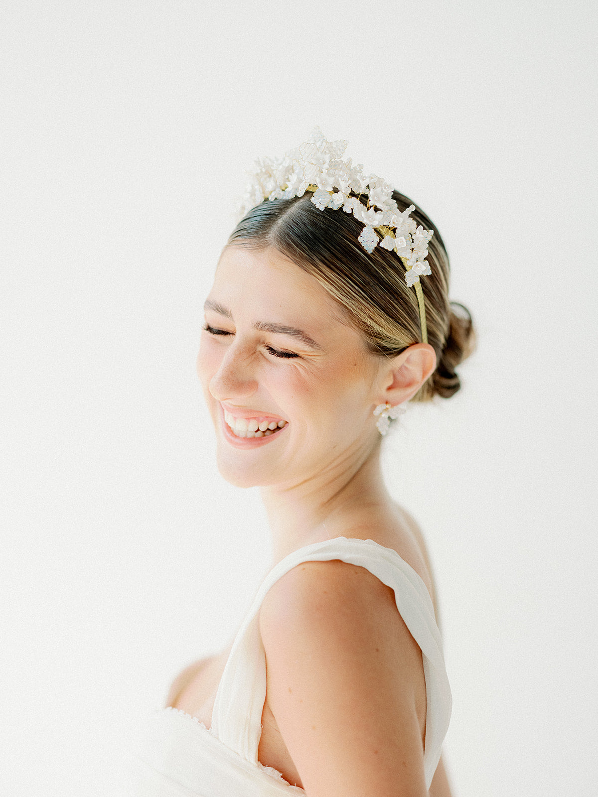 this headpiece is made with hundred of preciosa white opal crystal beads and clay flowers