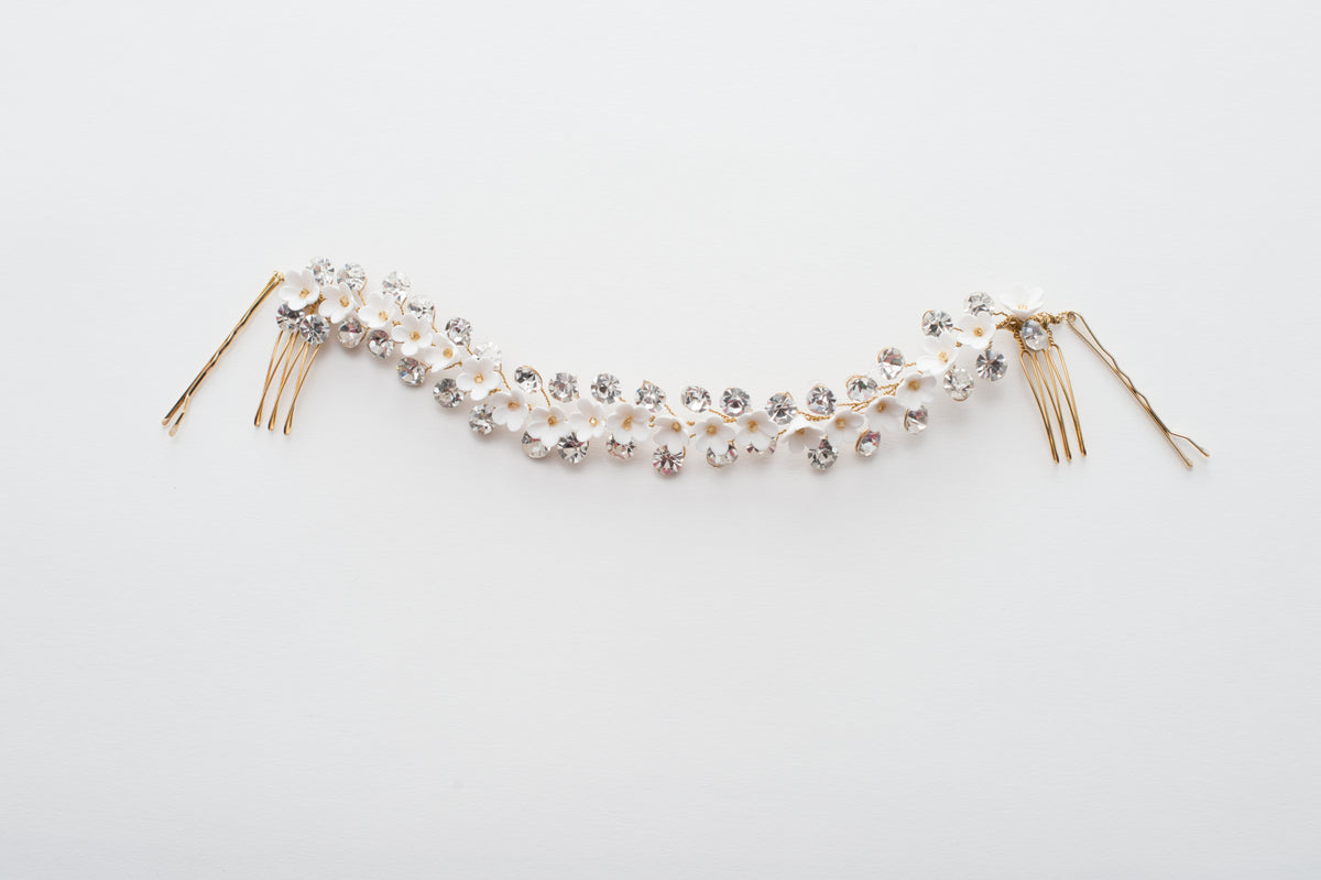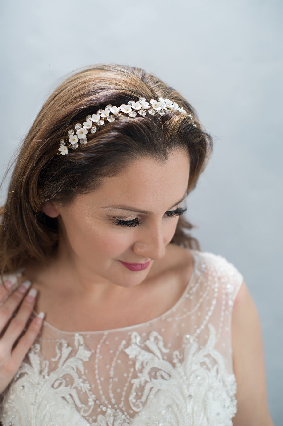 this headpiece is handmade and hand wired with Swarovski crystal, and polymer clay small flowers.