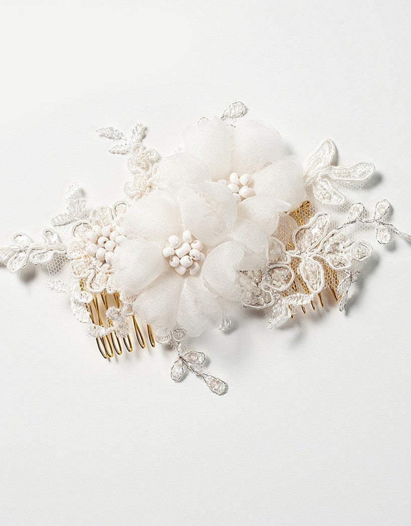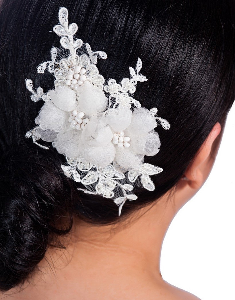 made with 2 small silk flowers on a beaded lace, for a vintage chic look.