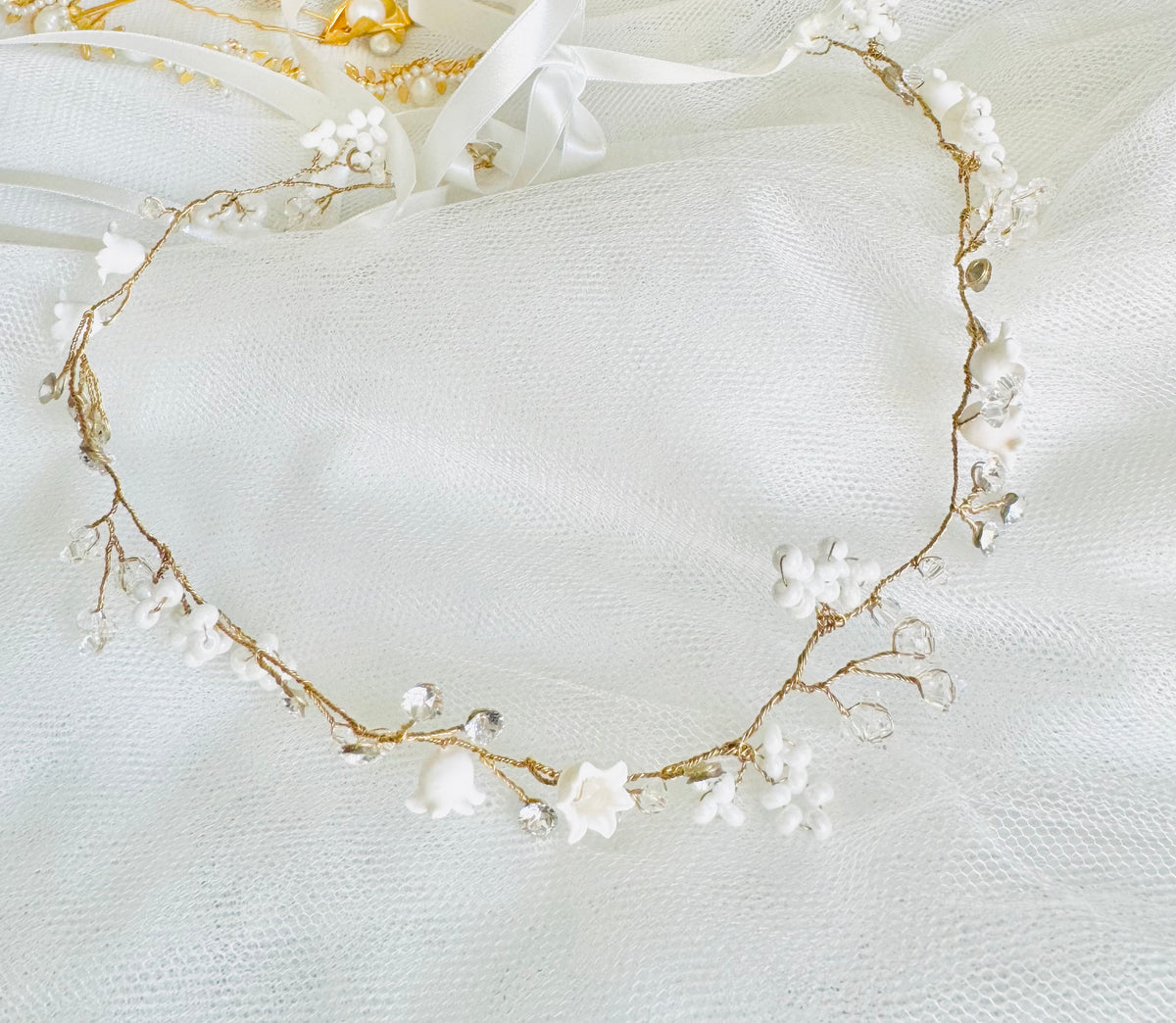 classic halo headpiece, this elegant floral vine features small clays flowers, crystal beads, rhinestones and glass beads, pins loops on each side with ribbon to tie