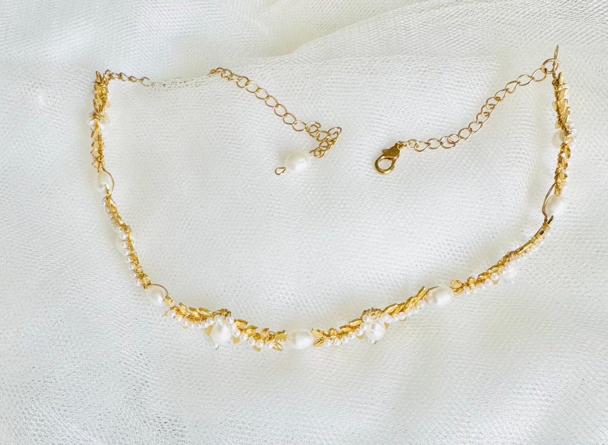 unique piece of jewelry, this chocker features small plated brass vines, adorned with freshwater pearls.