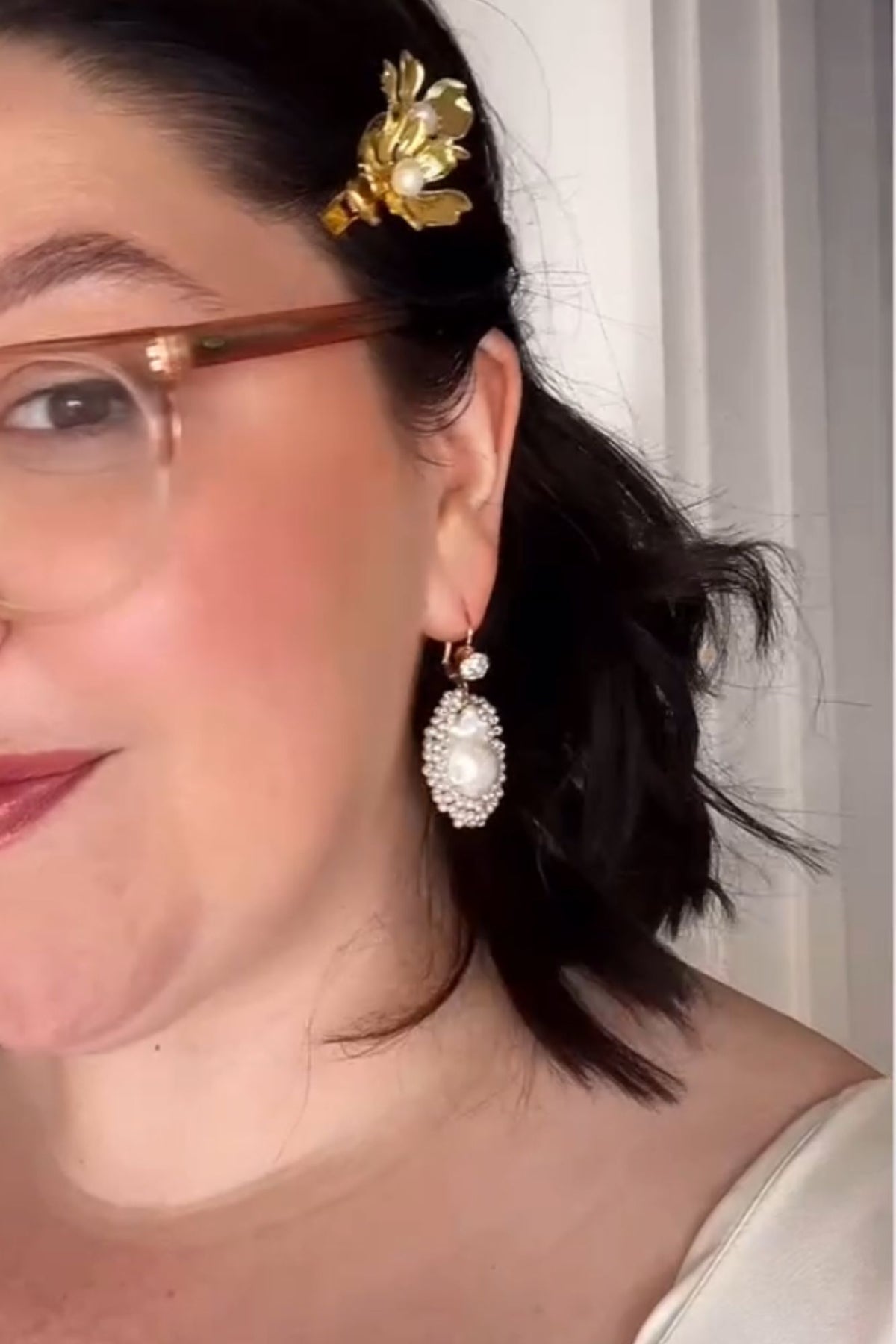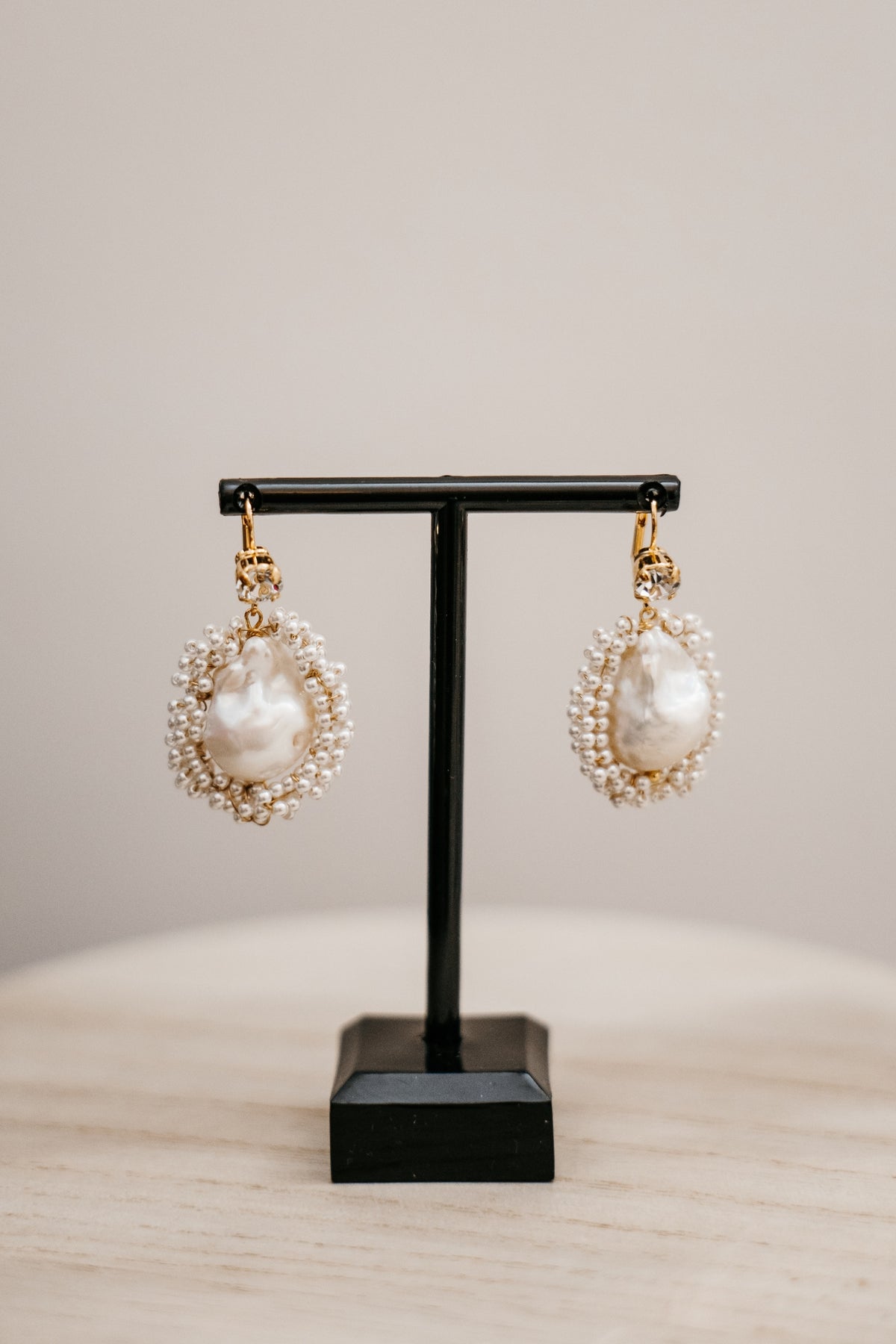 handmade in our studio, these earrings features plated leverback rhinestone base, tiny acrylic pearls and a big keshi pearl