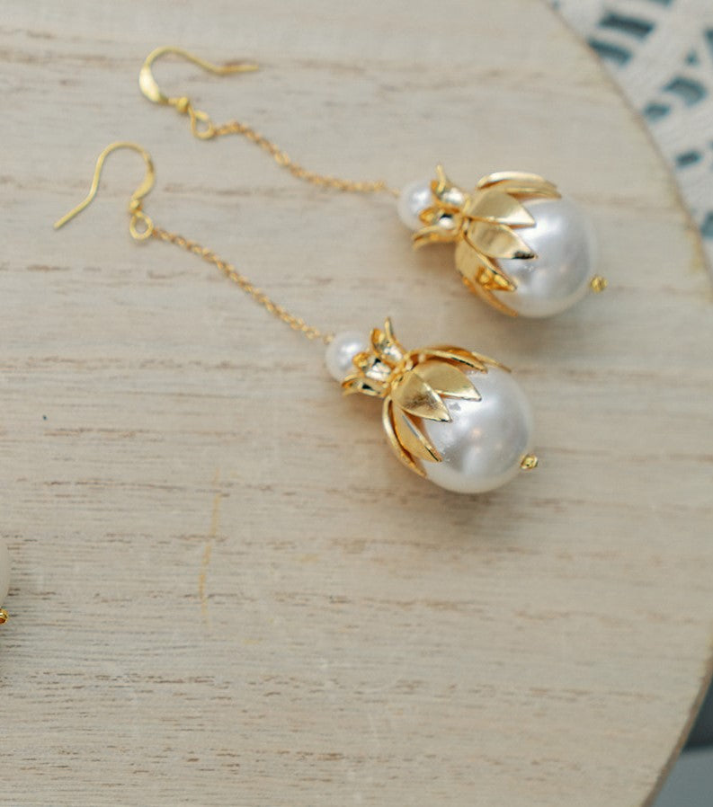 brass floral earring with oversize Pearl - ASTRID- 25032