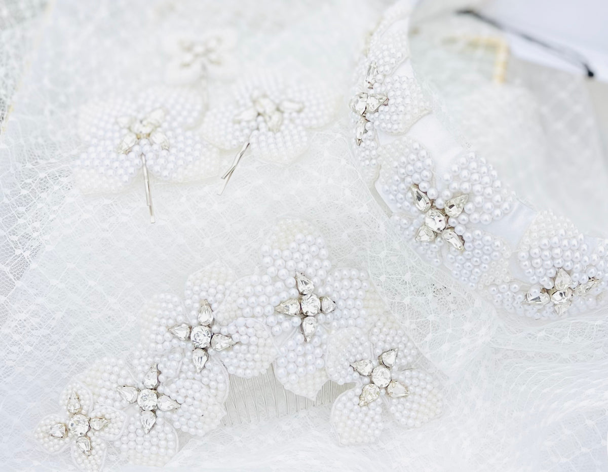 set of 3 Pearls beaded hair pins, classic elegant, timeless, beautiful, made with beaded pearls and rhinestones patches , they comes in a floral pattern and different sizes.
