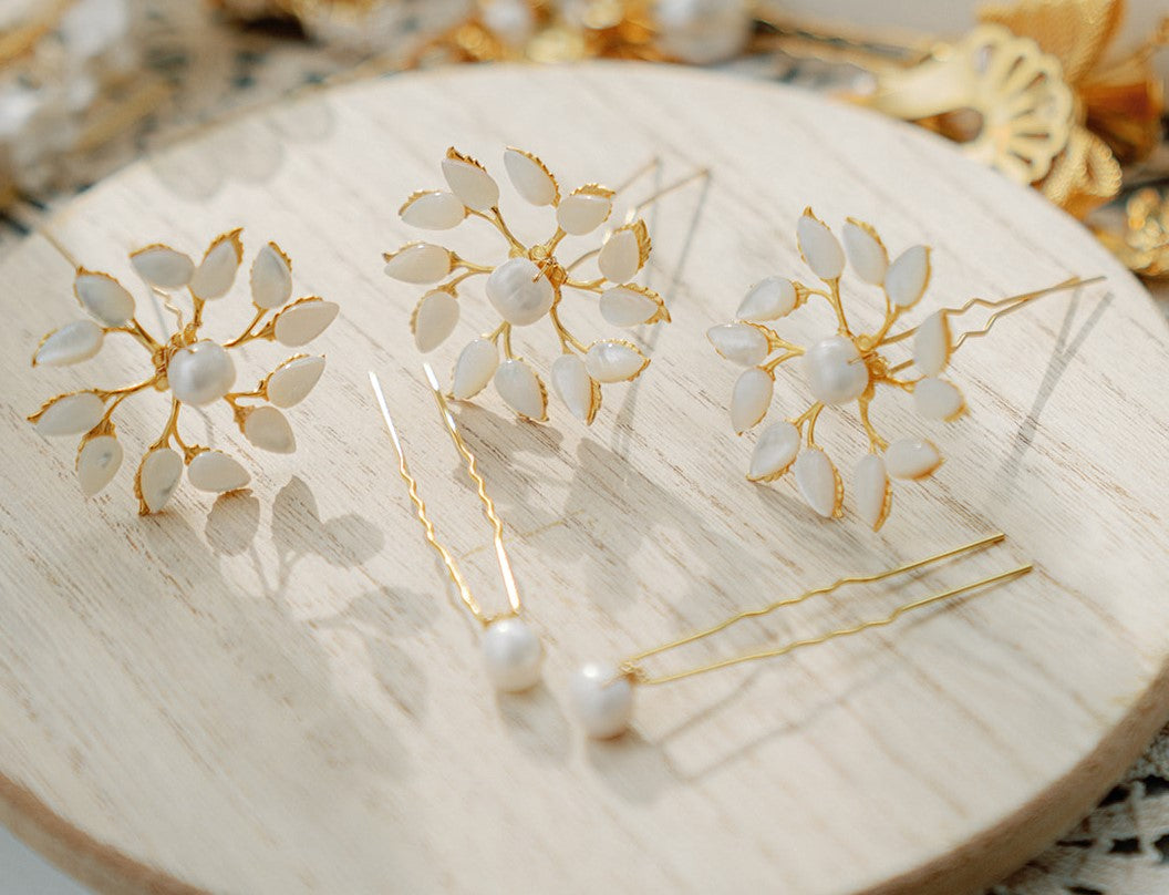 Mother of pearls cabochon adorned hair pin set of 5, made with Floral brass, MOP cabochons and freshwater pearls .
