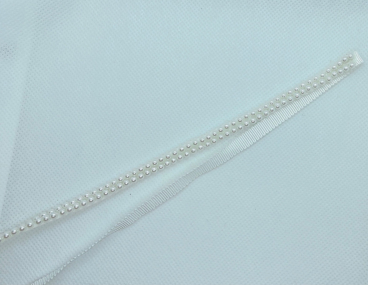 this simple bridal sash is made with 2 lines of faux pearls, attached to a grosgrain or double face satin ribbon in Ivory, White, or silver.