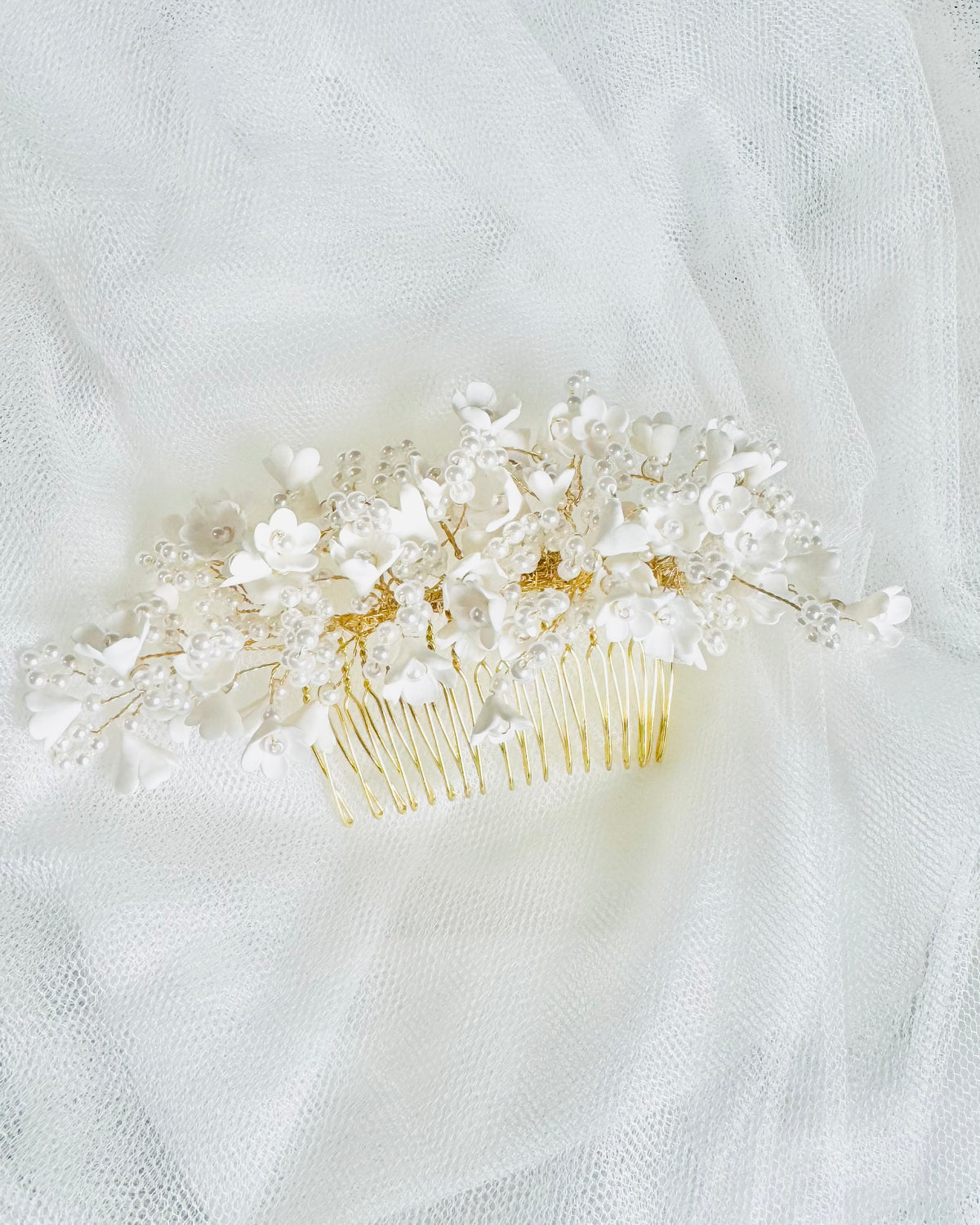 handcrafted patiently in our studio, this piece features hundreds of acrylic pearls and polymer clay flowers classic and timeless, this pheadpiece is simply elegant annd part of our baby breath wired collection