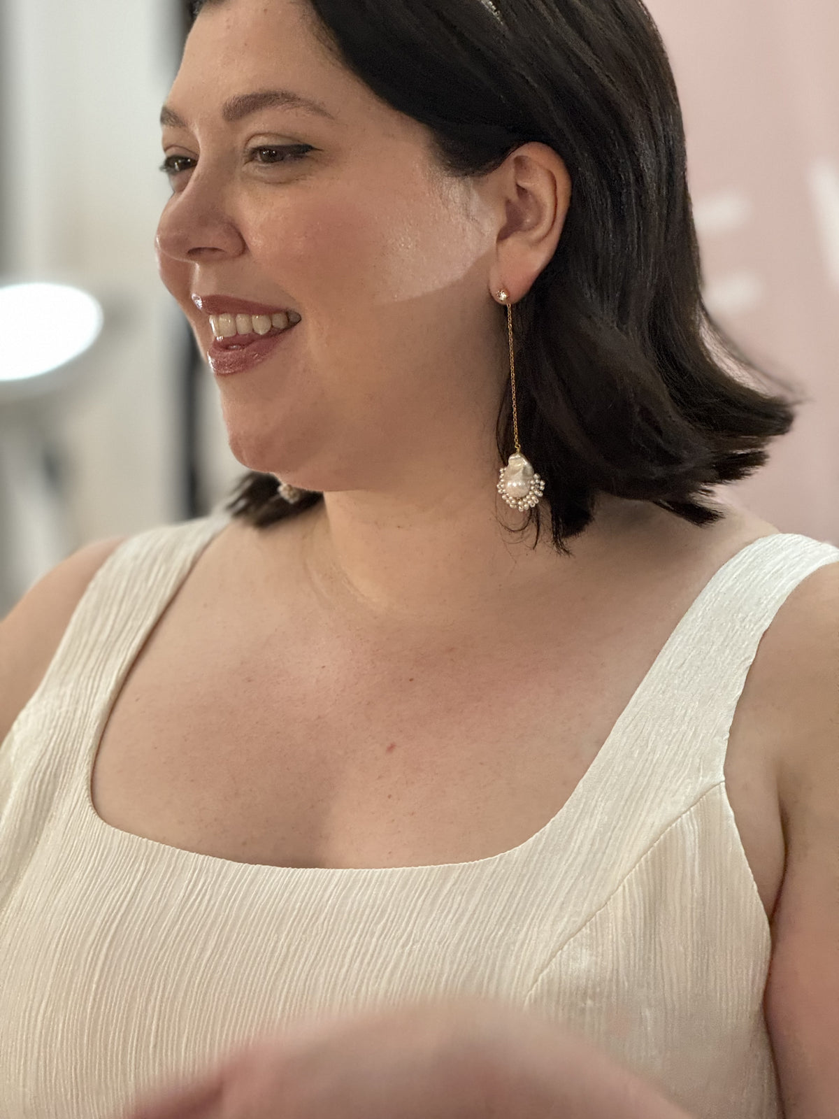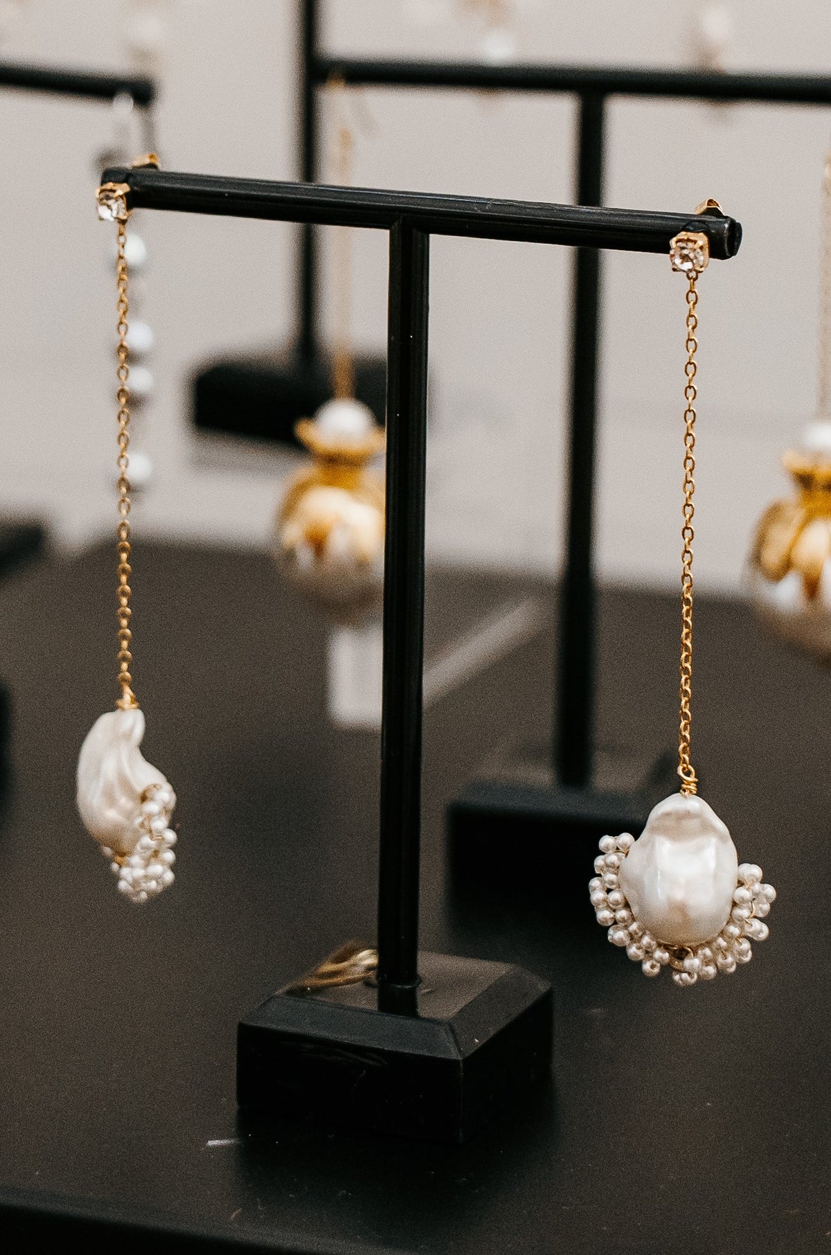 handmade in our studio, these earrings features a bended plated brass flower, tiny acrylic pearls and a big keshi pearl