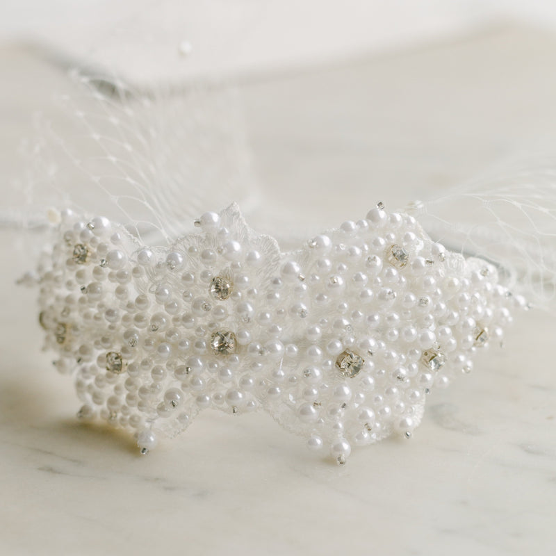 Birdcage headband veil with pearls and crystal beading-SOLEIL style 21028