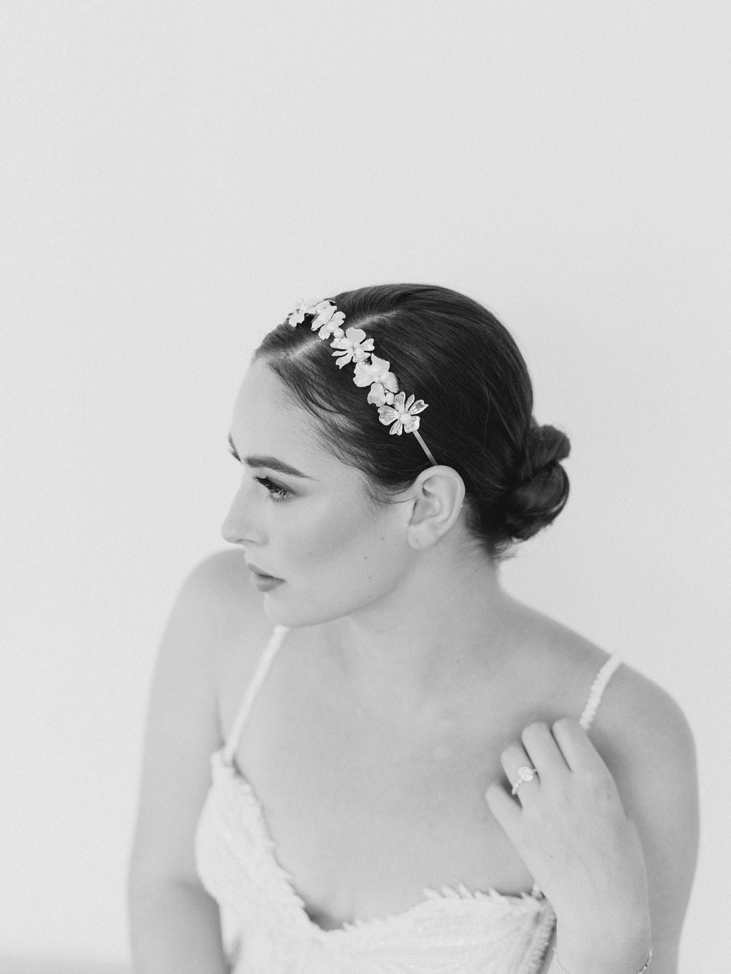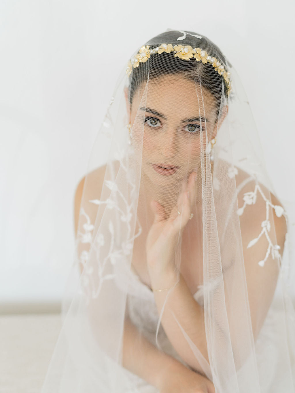 bridal headband made with variety of brass flowers, adorned with freshwater pearls, bright gold plated or silver rodhium plated