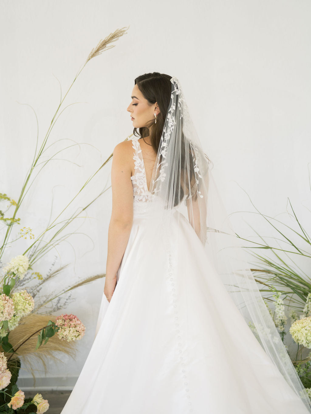 this unique and exquisite veil features handpainted floral vines motifs that grow and stretch beside your gown.