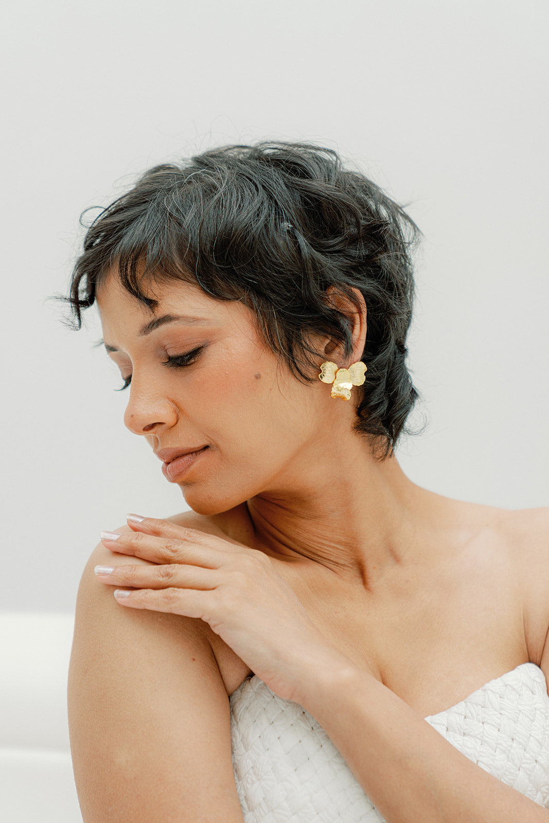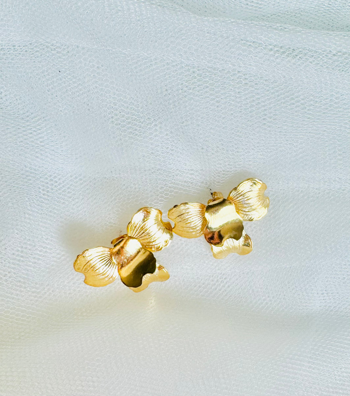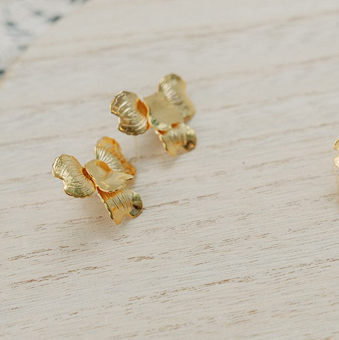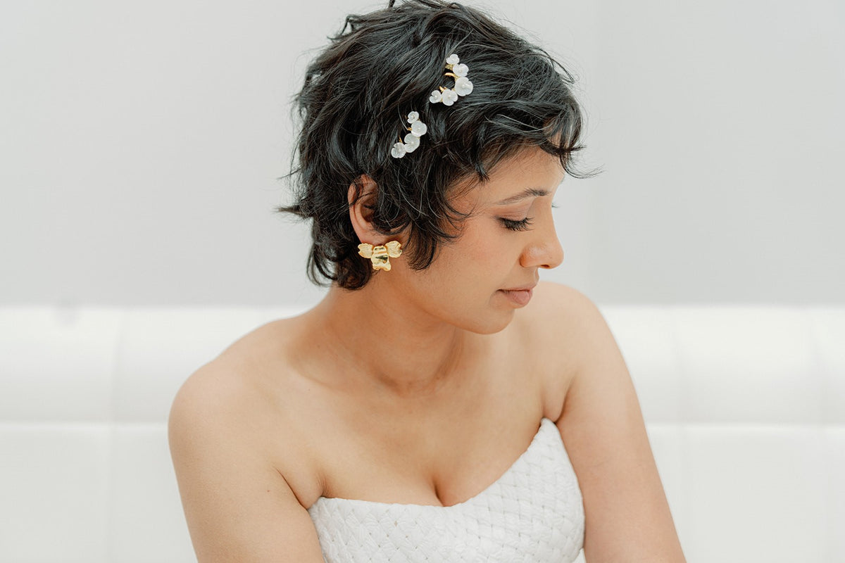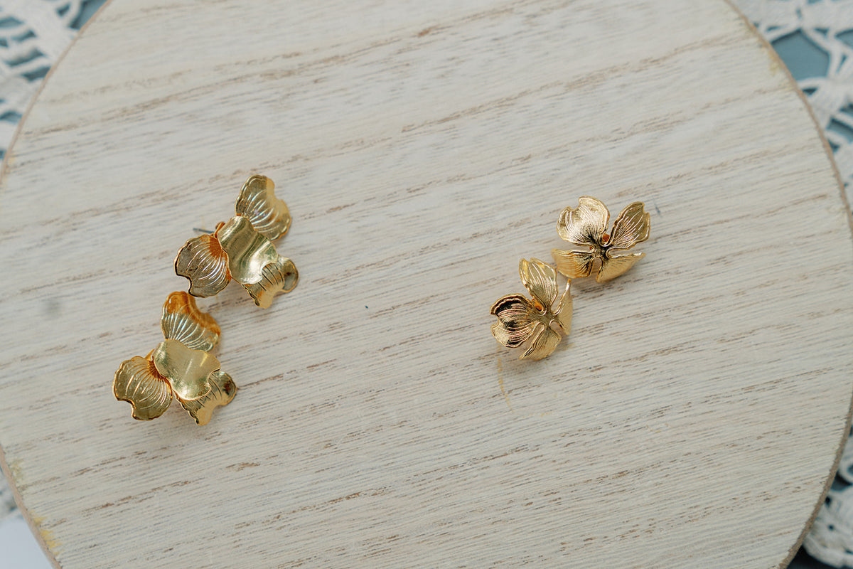 handmade in our studio, these earrings features bended brass flowers, plated in silver or gold, adorned with freshwater pearls.