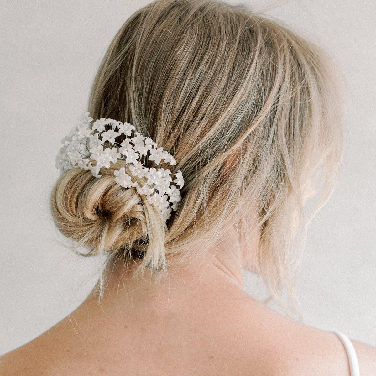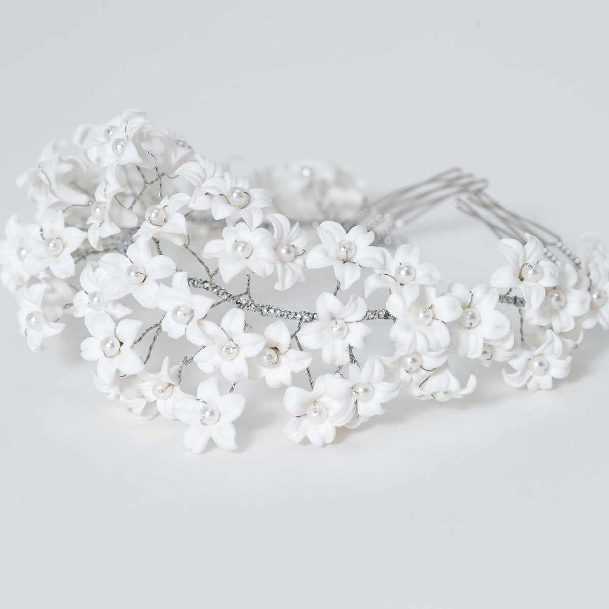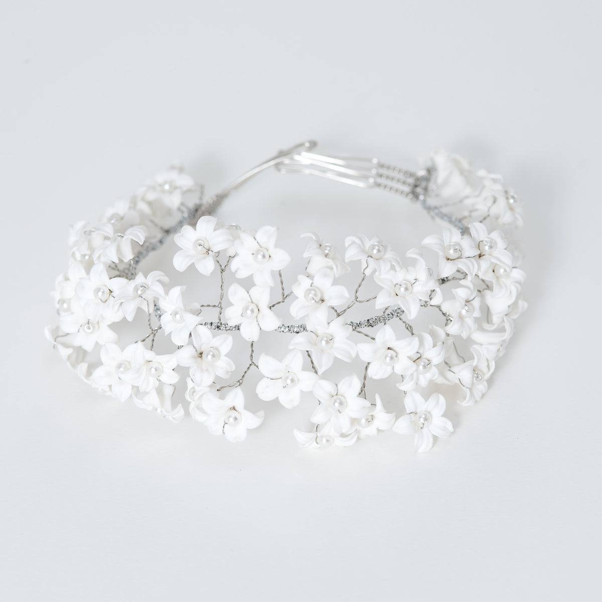 this piece is elegant, and classic, made with clay flowers and faux pearlsthis headpiece is very versitile, it can be worn in the back, on the side or as a headband or crown in the front.