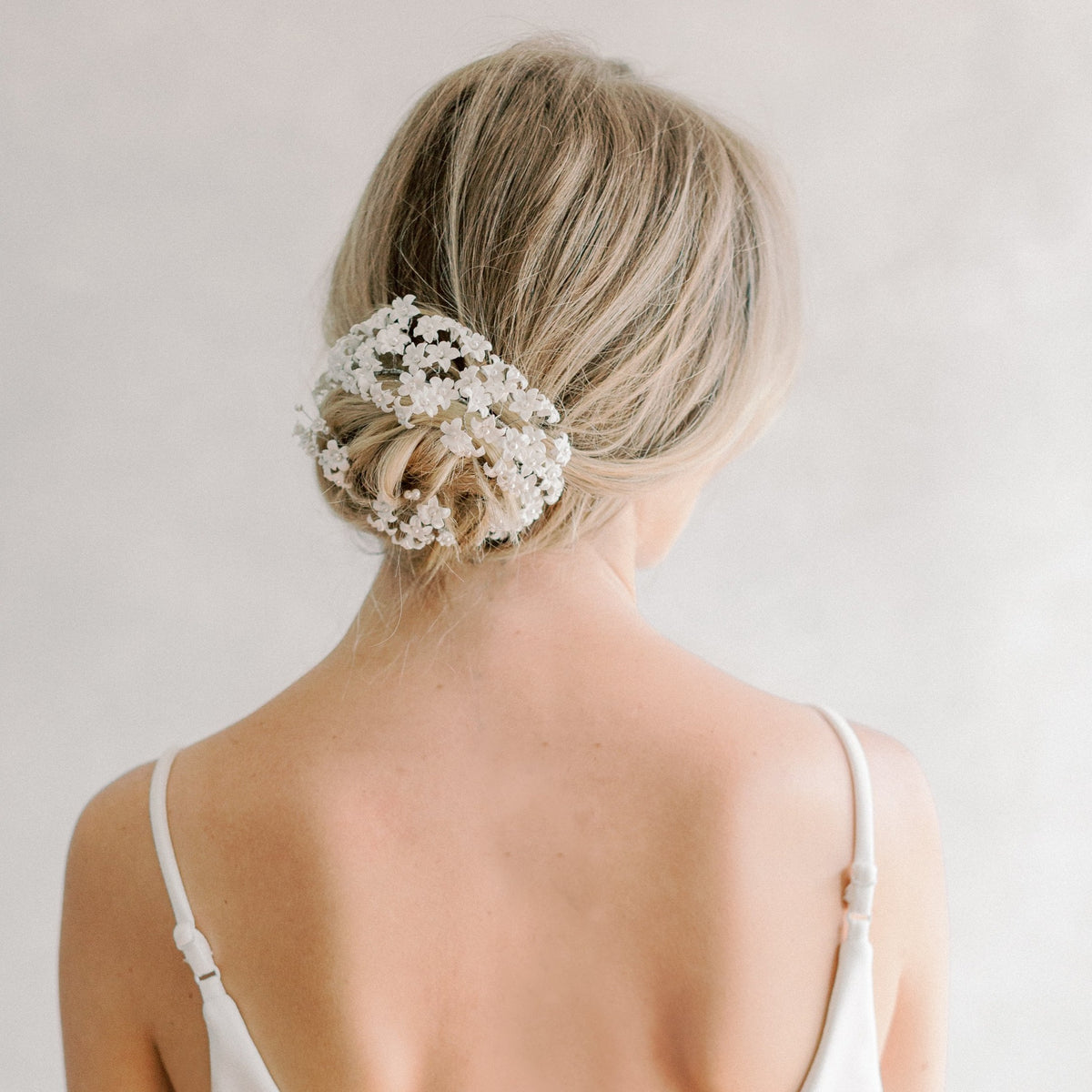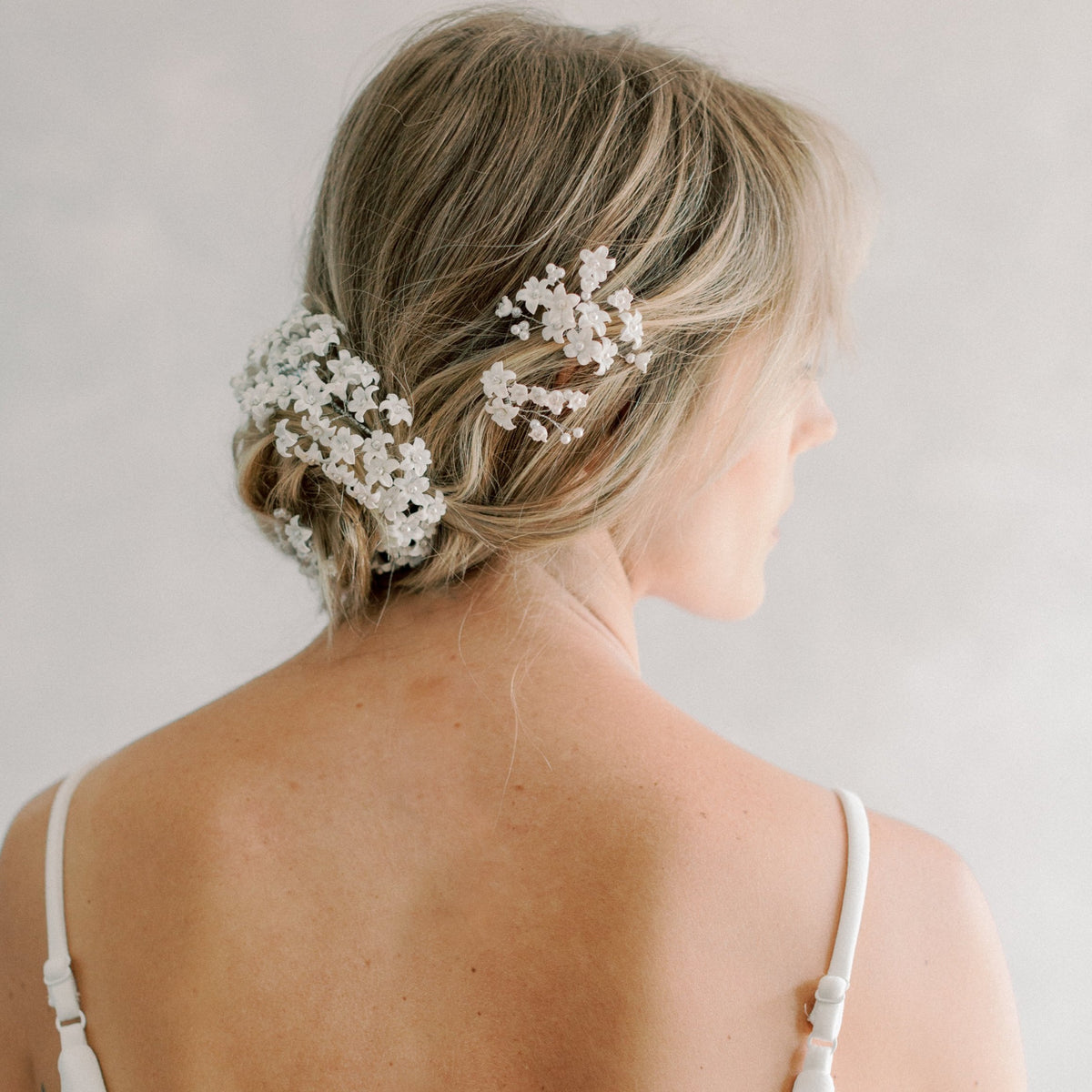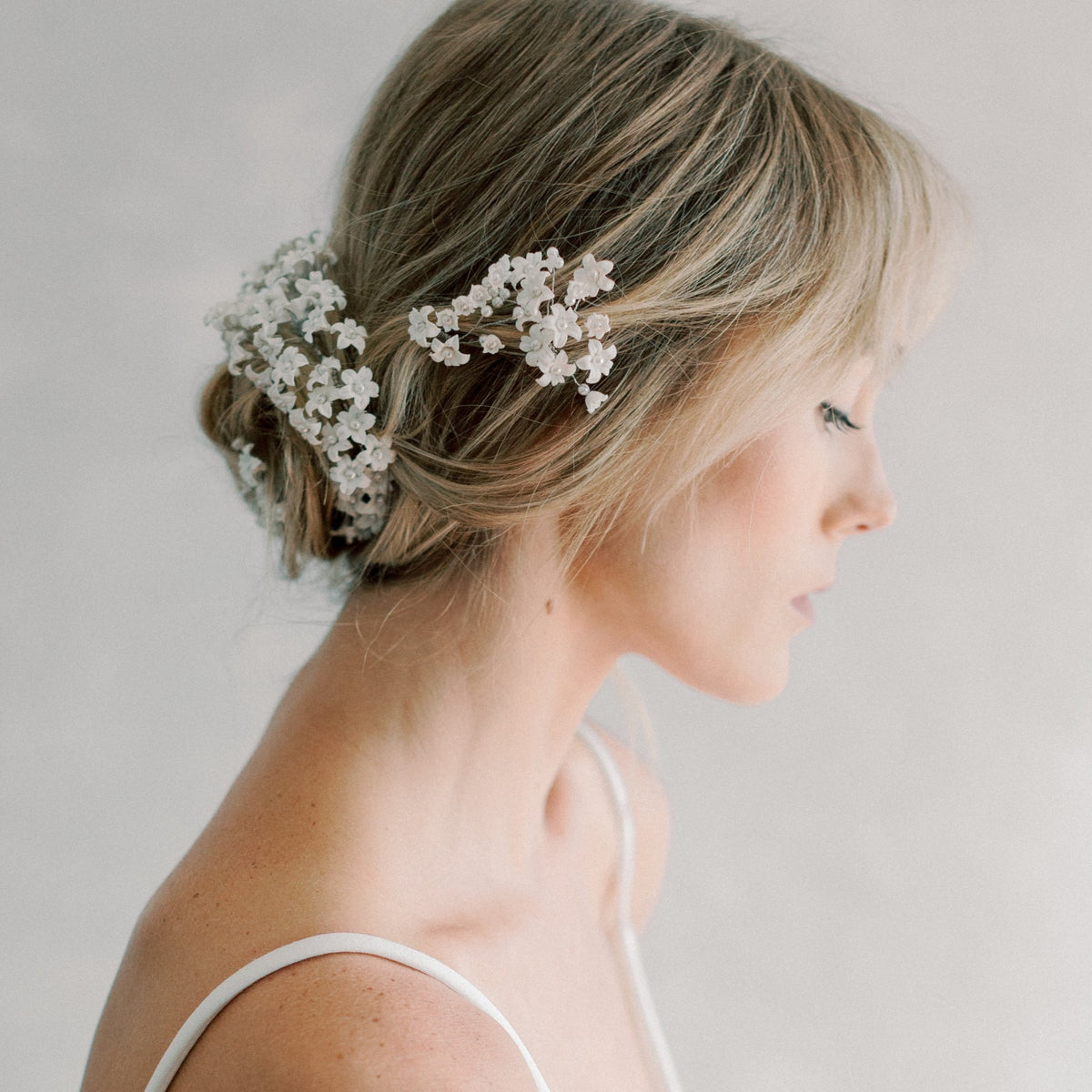 this piece is elegant, and classic, made with clay flowers and faux pearlsthis headpiece is very versitile, it can be worn in the back, on the side or as a headband or crown in the front.